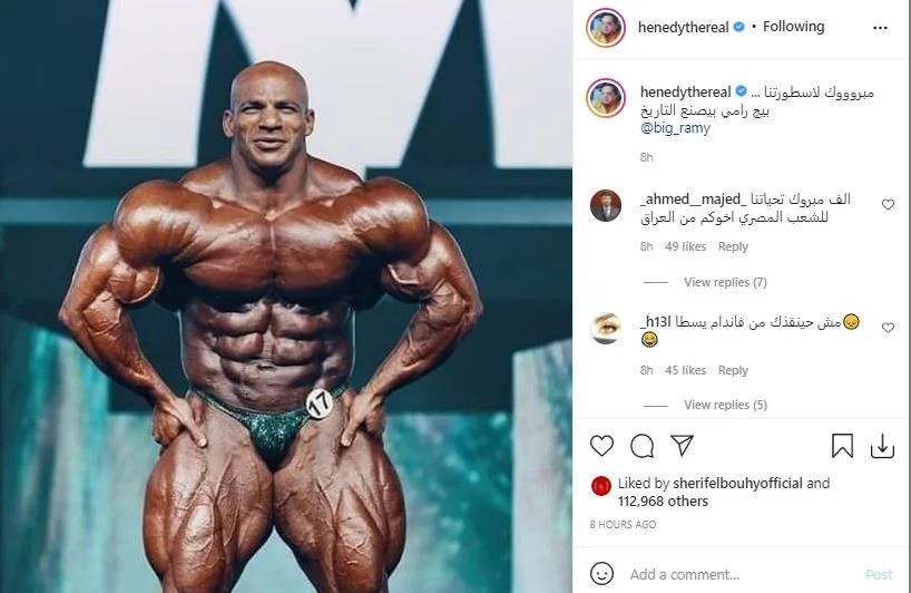 بعد فوزه بلقب مستر أولمبيا للعام الثانى على التوالى،هنأ الفنان محمد هنيدى، بيج رامى،بأوليمبيا 2021