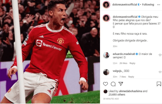 ونشرت والدة كريستيانو صورة له بعد تسجيله الهدف على حسابها بـ موقع التواصل الاجتماعى لتبادل الصور والفيديوهات “إنستجرام”، قائلة: “شكرا لك ابنى على الفرحة التى قدمتها لنا.. إنه ابنى عرقنا نادر، شكرا شكرا شكرا”.