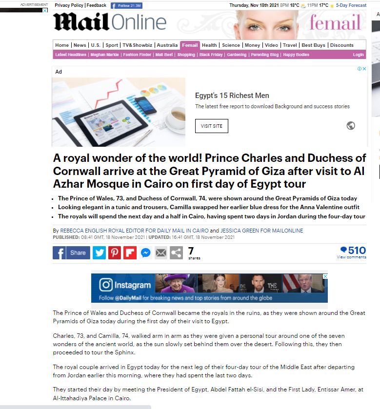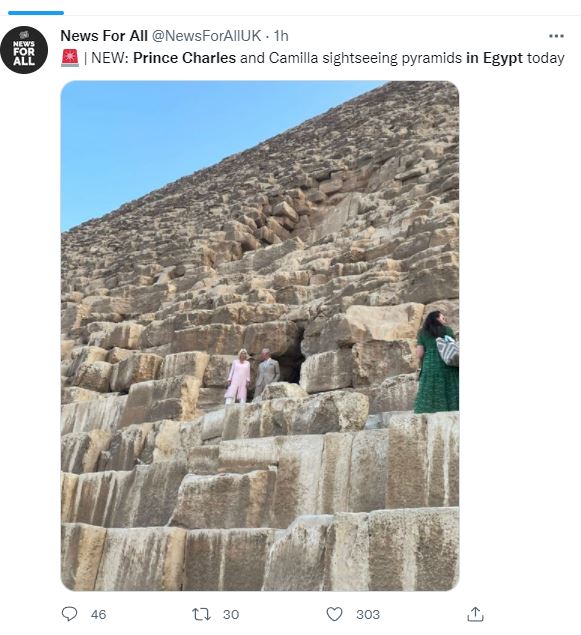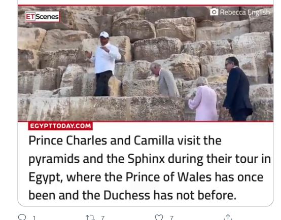 “عجائب الدنيا الملكية! (فى إشارة إلى أهرامات الجيزة)، وأضافت “وصول الأمير تشارلز ودوقة كورنوال إلى هرم الجيزة الأكبر بعد زيارة جامع الأزهر في القاهرة في اليوم الأول من جولة فى مصر، لكلا من أمير ويلز ، 73 عامًا ، ودوقة كورنوال ، 74 عامًا ، حول أهرامات الجيزة العظيمة اليوم.