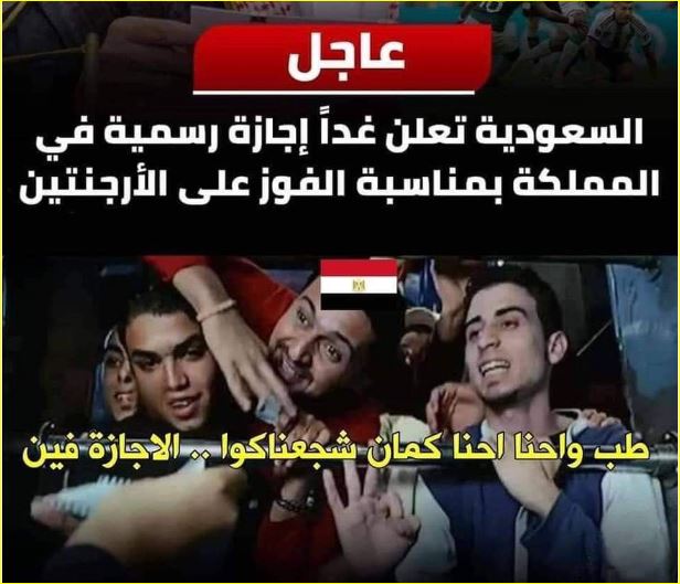 وعلى مستوى الجماهير العربية العاشقة لكرة القدم، تبارت الشعوب العربية فى التعبير عن فرحتها بفوز الأخضر فى المحفل العالمى، بنشر العديد من مقاطع الفيديو التى تظهر الفرحة الهيسترية، بالفوز، والتهنئة، وبرز الشعب المصرى بخفة دمه، ينشر “كوميكس” يعبر عن فرحته بفوز الأخضر السعودى.