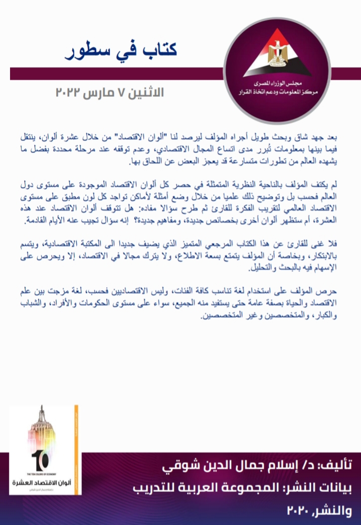 فى إطار اهتمام مركز المعلومات ودعم اتخاذ القرار التابع لمجلس الوزراء، بالمؤلفات الجادة، والدراسات التى تضيف لصانعى القرار، والمتخصصين، فى شتى المجالات، أدرج المركز أحد أهم إصدارات الخبير الاقتصادى د. إسلام جمال الدين شوقى، الذى يحمل عنوان: “ألوان الاقتصاد العشرة” ضمن الكتب الموصى بها كمرجع متميز.
