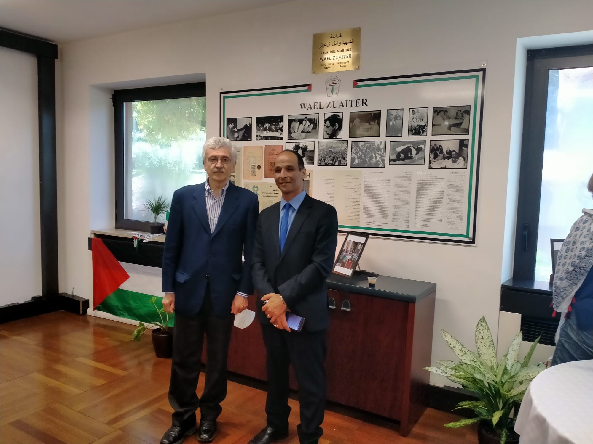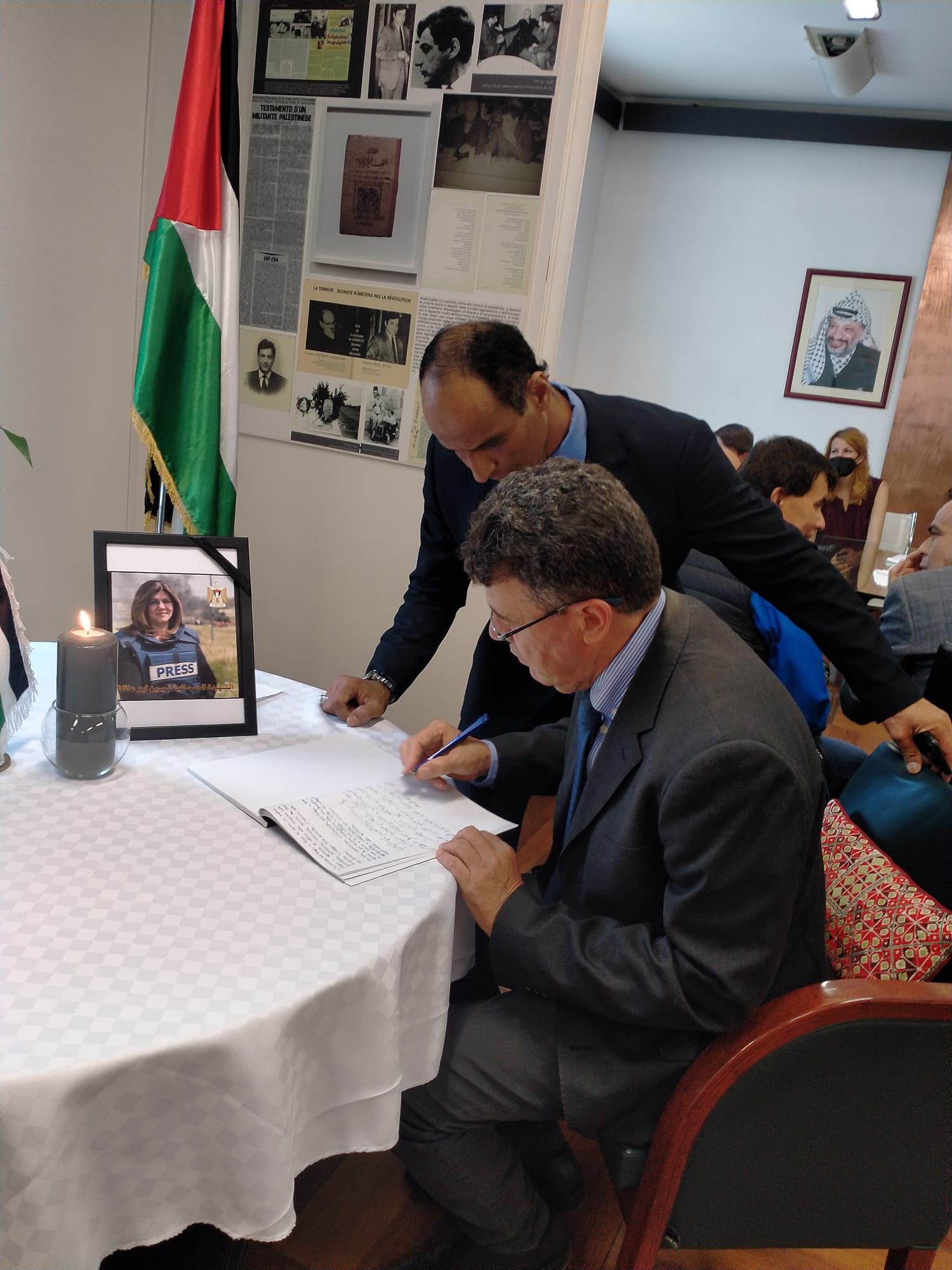 وقام رئيس الجالية البروفيسور فؤاد عودة بالكتابة في دفتر العزاء معربا عن تعازي وتضامن جالية العالم العربي في إيطاليا و وقوفها إلي جانب الحق الفلسطيني.