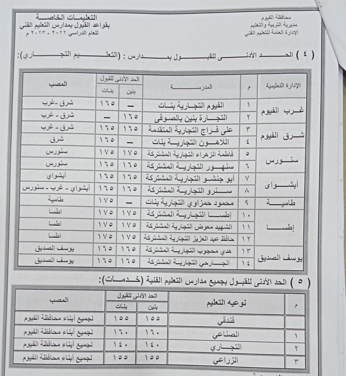 كما تراوحت درجات القبول بمدارس التعليم الفنى الصناعي، من 190 درجة إلى 175 درجة، عدا مدرستي الفيوم الصناعية الميكانيكية “مهني بنين” والفنية بنات الجديدة “مهني بنات” لخريجى الإعدادية المهنية، جاء الحد الأدنى للقبول بهما بمجموع140 درجة، فيما جاء الحد الأدنى للتنسيق بمدارس التعليم التجاري بمجموع درجات يتراوح من 165 درجة إلى 175 درجة، وبالنسبة للقبول بمدارس التعليم الفنية “خدمات” الفندقي والزراعي بمجموع 155 درجة، والصناعي 160 درجة، والتجاري 140 درجة.