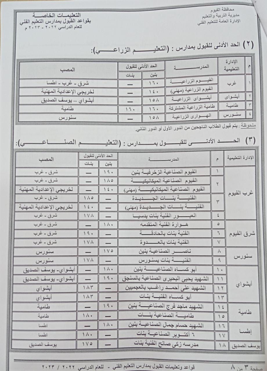 فيما تراوحت درجات القبول بالمدارس الفنية الزراعية، من 160 درجة إلى 140 درجة، بواقع 160 درجة لمدرستي الفيوم الزراعية، وطامية الزراعية المشتركة، و 158 درجة للقبول بمدرستى أبشواي الزراعية، والهواري الزراعية بسنورس، و140 درجة لمدرسة الفيوم الزراعية ” مهني بنين” لخريجى الإعدادية المهنية.