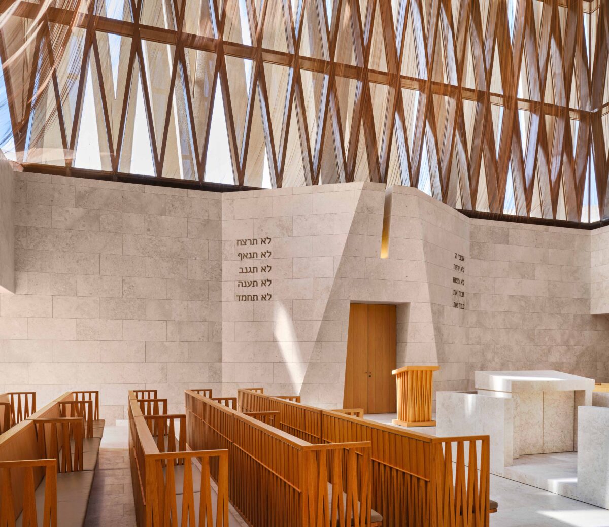 وحسب الموقع الأليكترونى اليهودى، قال أدجاي إن مصدر إلهامه للكنيس الموجه نحو القدس هو يوم العيد اليهودي “سكوت” أحد الأعياد المركزية في اليهودية، ويُعرف بالعبرية “سوكوت” أي “المظال” أو “العُرش”، مضيفا أن العوارض المتقاطعة التي ترتفع إلى السطح، تسمح للضوء بالمرور من خلال الفجوات، وتمثل سعف النخيل أو النباتات التي تغطي السكة، وتسمح للمصلين بالتطلع “إلى السماء”.