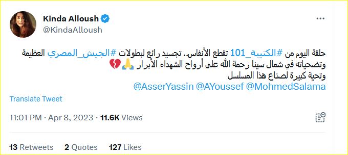 وقالت “علوش فى تغريدة لها على حسابها بموقع التواصل “تويتر” : “حلقة اليوم من #الكتيبة_101 تقطع الأنفاس.. تجسيد رائع لبطولات #الجيش_المصري العظيمة وتضحياته في شمال سينا”.