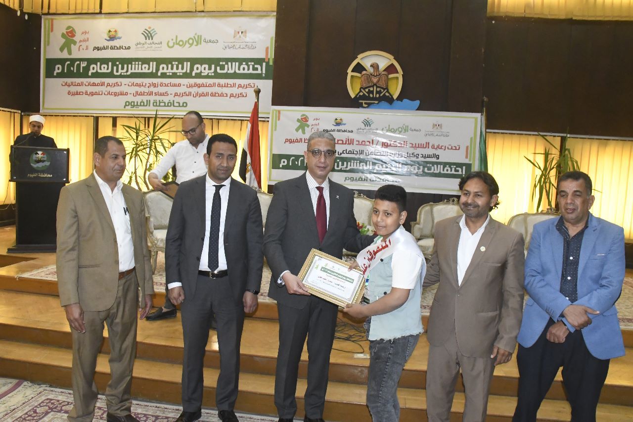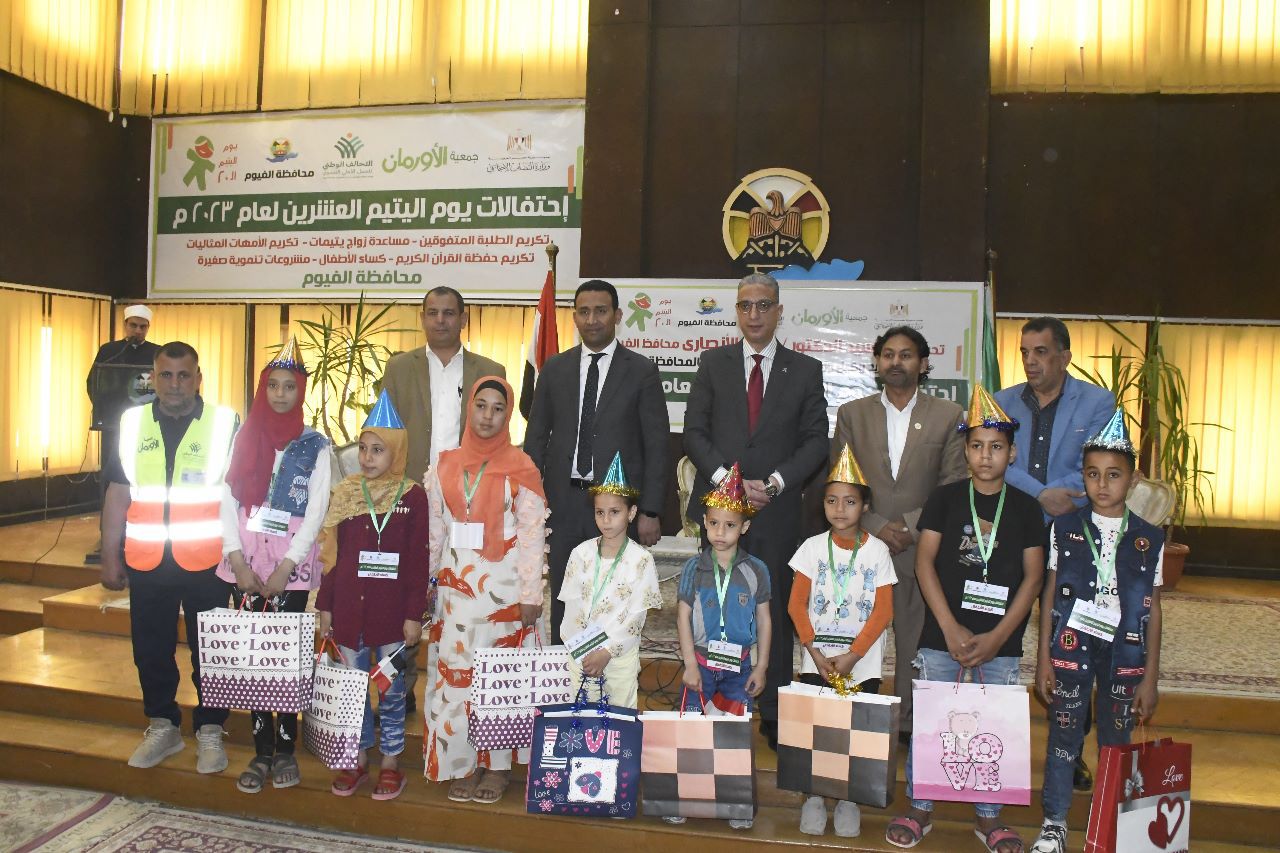 ومن جانبه رحب مدير المشروعات بجمعية الأورمان، بمحافظ الفيوم، مقدماً له الشكر لاستضافته الكريمة للاحتفال السنوى بيوم اليتيم، مشيراً إلى أن اليوم بصدد تسليم ملابس العيد لعدد 125 طفلاً وطفلةً، وكذاً منح مساعدات مالية لعدد 5 فتيات مقبلات على الزواج من غير القادرات، بمبلغ 10 ألاف جنيه لكل واحدة منهن، وكذا تكريم عدد 10 من المتفوقين علمياً بمراحل التعليم الأساسي منهم إثنين من حفظة القرآن الكريم، بمنحهم شهادات التقدير ومبلغ 500 جنيه لكل منهم، كما تم تكريم إحدى الأمهات المثاليات.