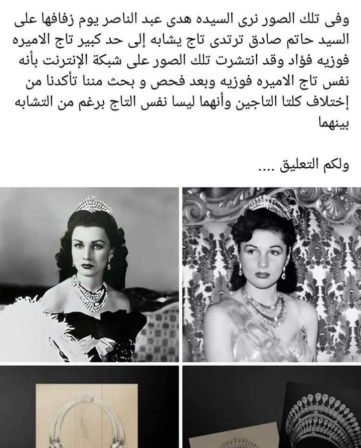 وحاول أصحاب هذه الأكذوبة أن يجدوا صورة واحدة للأميرة فوزية وهى ترتدى نفس التاج الذى ارتدته هدى عبدالناصر يوم زفافها فلم يجدوا.