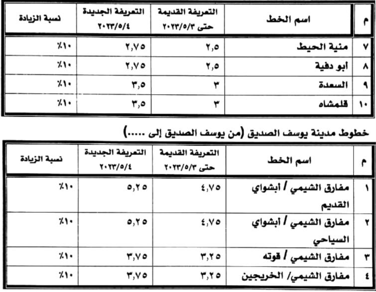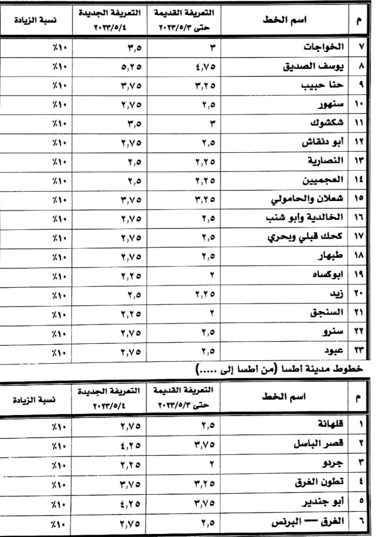 ووجه المحافظ، مدير عام المواقف، بالإعلان عن التعريفة الجديدة في مكان واضح بجميع مواقف السيارات بدائرة المحافظة، من خلال وضع لافتة مبيناً بها خطوط السير، وقيمة الأجرة المقررة لكل خط، وكذا وضع استيكرات موضح به تعريفة الركوب وخط السير وعدد الركاب يتم لصقها على الزجاج الأمامي والخلفي لسيارات الأجرة والسرفيس، لتوعية المواطنين بتعريفة الركوب الرسمية، مع تطبيق القانون بكل حزم على المخالفين.