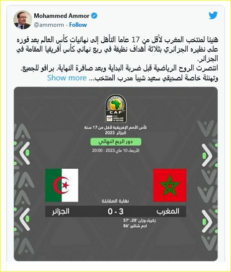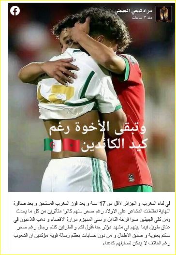 وفى معرض التعليق على صور العناق الأخوى، والروح الرياضية التى سادت لقاء الأشقاء: كتب أحد رواد “السوشيال تعليقا قال فيه: “في لقاء المغرب و الجزائر لأقل من 17 سنة و بعد فوز المغرب المستحق و بعد صافرة النهاية اختلطت المشاعر على الأولاد رغم صغر سنهم كانوا متأثرين من كل ما يحدث ومن كلى الجهتين نسوا فرحة التاهل و نسى المنهزم مرارة الاقصاء و ذهب اللاعبون في عناق طويل فيما بينهم في مشهد مؤثر جدا، أقول لكم و للطرفين كنتم رجال رغم صغر سنكم بعفوية و صدق الأطفال و من دون حسابات بعثتم رسالة قوية مؤكدين أن الشعوب رغم الخلاف لا يمكن تصنيفهم كاعداء”.