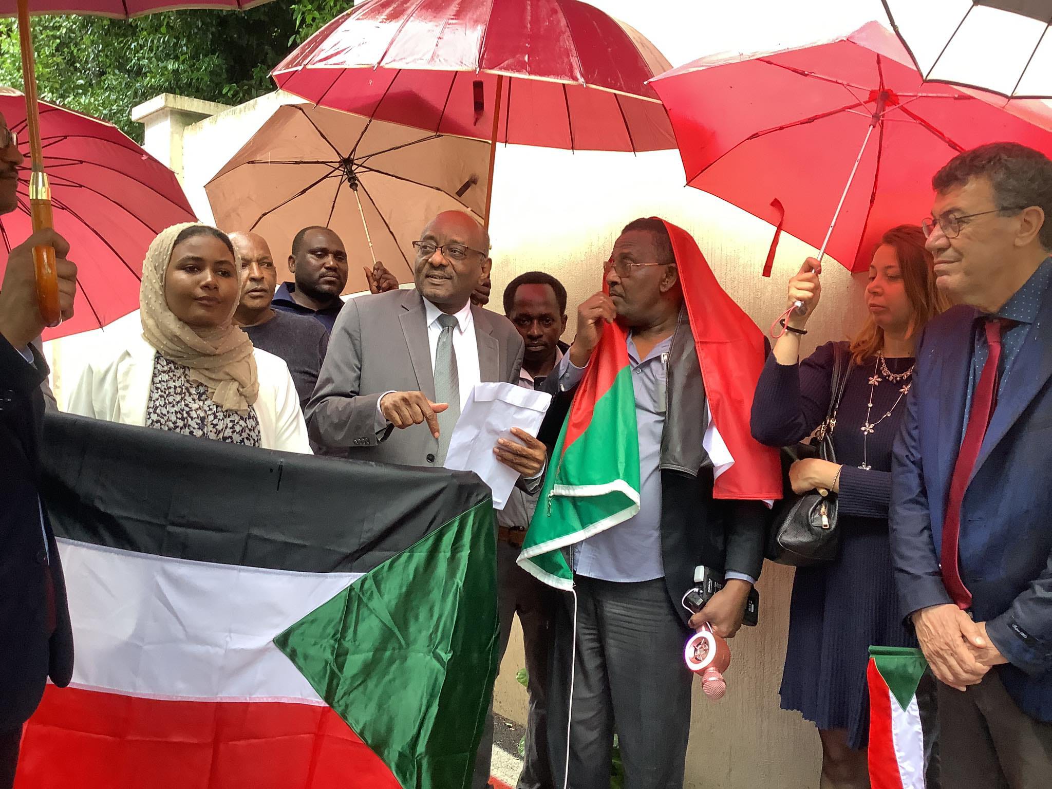 وقام بتسليم البيان للسفير السيد الطيب أحمد نيابة عن التجمع الناشط أدم السني.