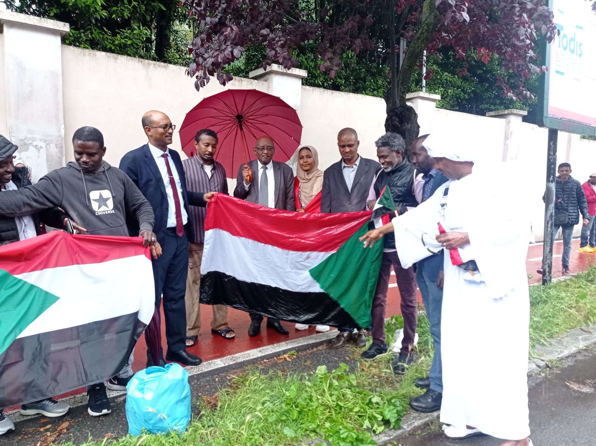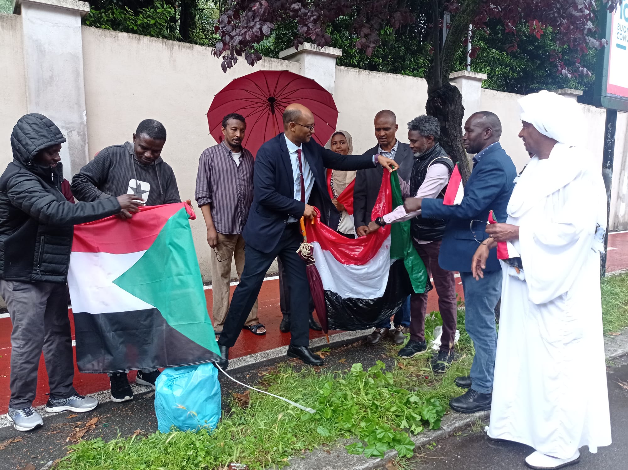 نظّم أبناء الجالية السودانية بروما أمس الأثنين 22 مايو، وقفة أمام مقر السفارة السودانية بروما، لدعم وحدة الدولة السودانية.