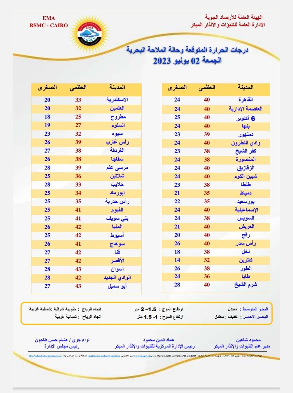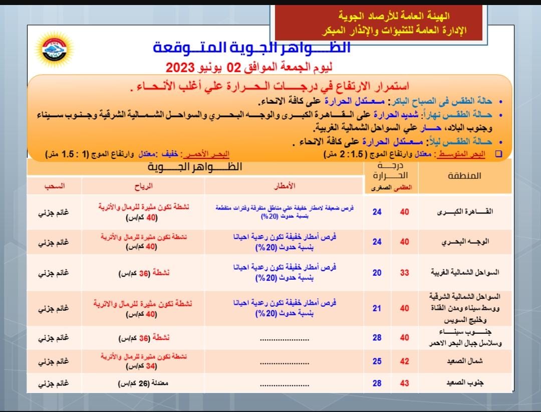 الأرصاد تكشف حالة الطقس والظواهر الجوية للغد الجمعة 2 يونية 2023
