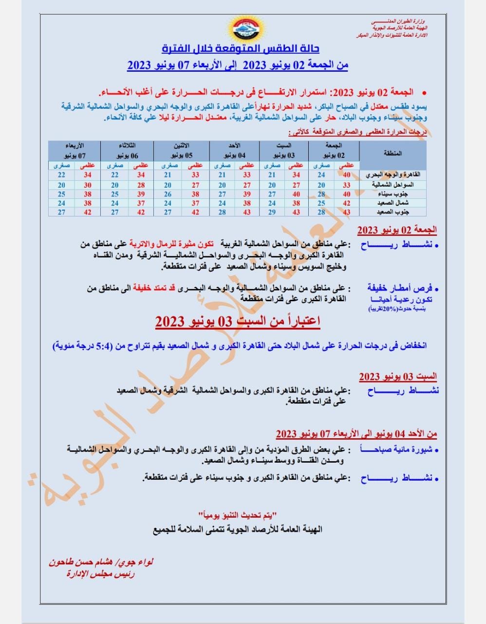 كشفت هيئة الأرصاد الجوية عن حالة طقس الغد، الجمعة 2 يونية 2023، بكل تفصيلاته، بما فيها الظواهر الجوية المتوقعة، وحالات الرياح، ودرجات الحراراة المتوقعة، على الأنحاء المختلفة لجمهورية مصر.