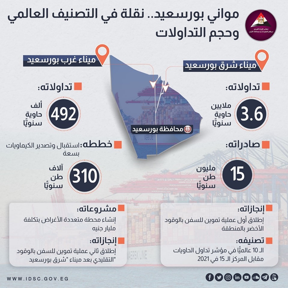 - %54 من صادرات الملابس الجاهزة تخرج من بورسعيد.. وطفرة بزراعات البنجر والقمح والشعير والخضراوات والفاكهة بالمحافظة - بورسعيد أول مدينة في "التأمين الصحي الشامل" في 2019.. والمحافظة نجحت في القضاء على العشوائيات منذ 2018 - بورسعيد أول محافظة تقدم نحو 147 خدمة رقمية سواء في مجالات التموين أو الشهر العقاري أو الأحوال الشخصية وغيرها