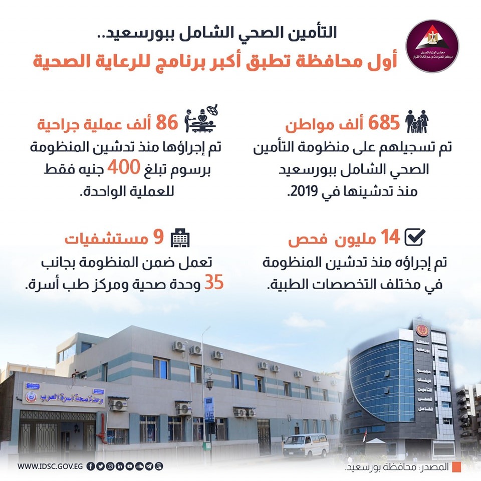 وفيما يتعلق بمشروعات الرعاية الصحية، لفت المحافظ، إلى أن بورسعيد أصبحت أول مدينة تغطيها خدمات التأمين الصحي الشامل في الجمهورية في عام 2019، وكذلك أصبحت أول محافظة تقدم نحو 147 خدمة رقمية؛ سواء في مجالات التموين أو الشهر العقاري أو الأحوال الشخصية، وذلك بعد إطلاق الكارت الموحد، مضيفًا أن محافظة بورسعيد تضم عددًا من المناطق الصناعية، مثل: المنطقة الصناعية التابعة للهيئة العامة للاستثمار، والتي تضم 29 مصنعًا، وأكثر من 35 ألف عامل ، ومسؤولة عن تصدير نحو 54% من حجم صادرات مصر من الملابس الجاهزة.