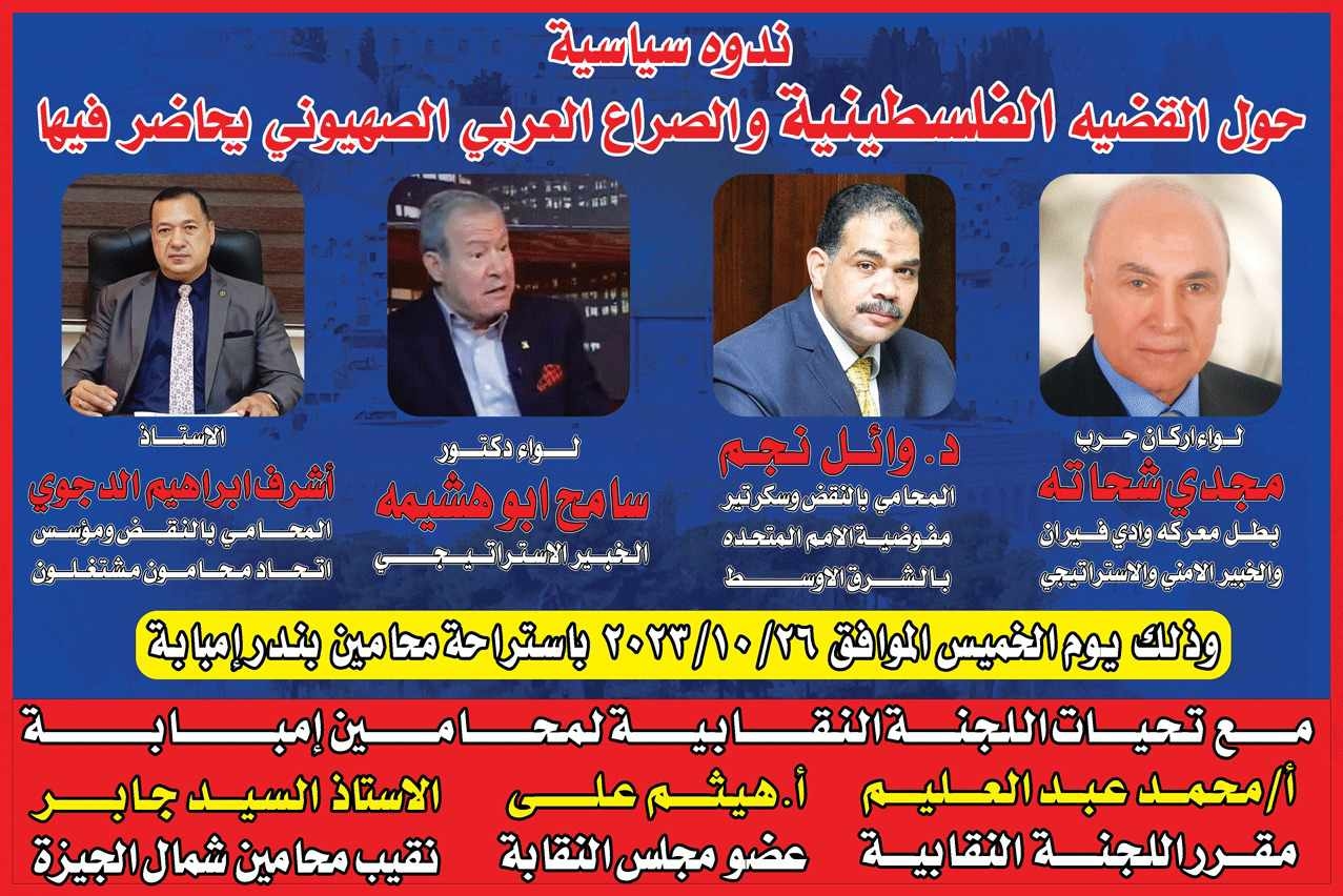 جاء ذلك من خلال مشاركة نجم فى الندوة، التى انعقدت أمس الخميس بمقر اللجنة النقابية للمحامين بإمبابة، برعاية وإشراف اللجنة، لدعم ونصرة القضية الفلسطينية، والأشقاء فى عموم فلسطين المحتلة، وغزة.