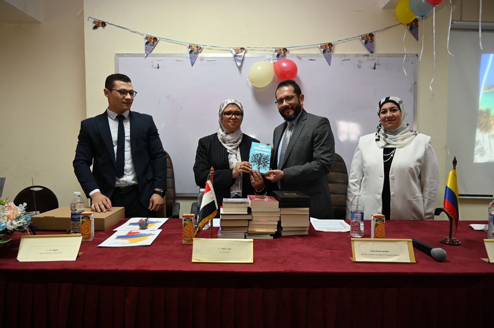 وفي نهاية اللقاء قام كارلوس اندريس اورتادو بإهداء مكتبة كلية الألسن مجموعة من الكتب الأدبية بقلم عدد من الكتاب الكولومبيين ، بعضها باللغة الإسبانية والآخر مترجم الي اللغة العربية.