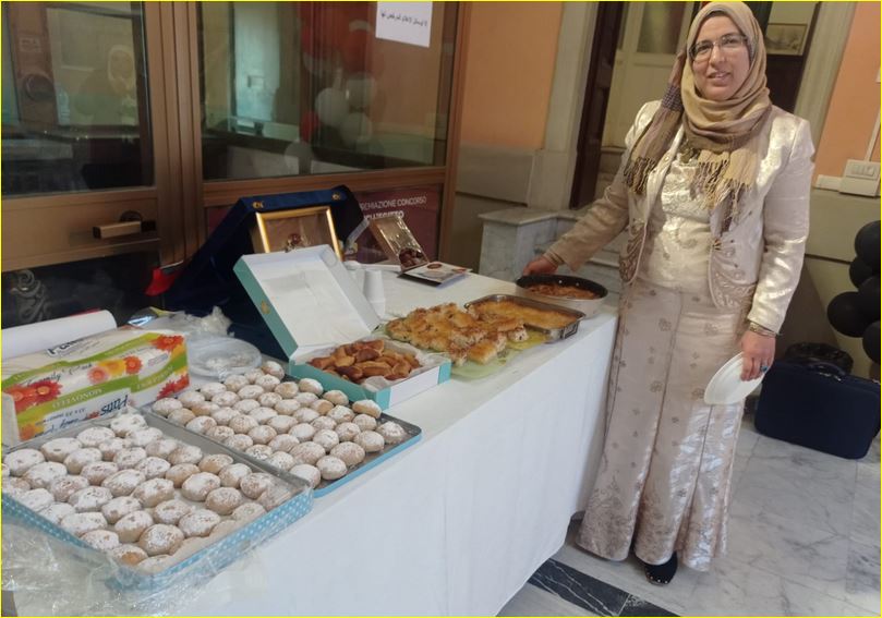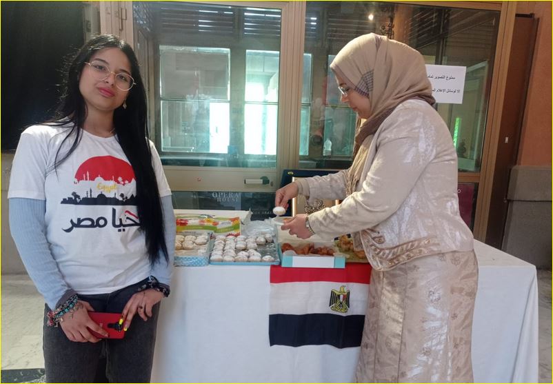 سيدة مصرية تخطف الإنظار بتوزيعها حلويات وكعك مصري على الناخبين.