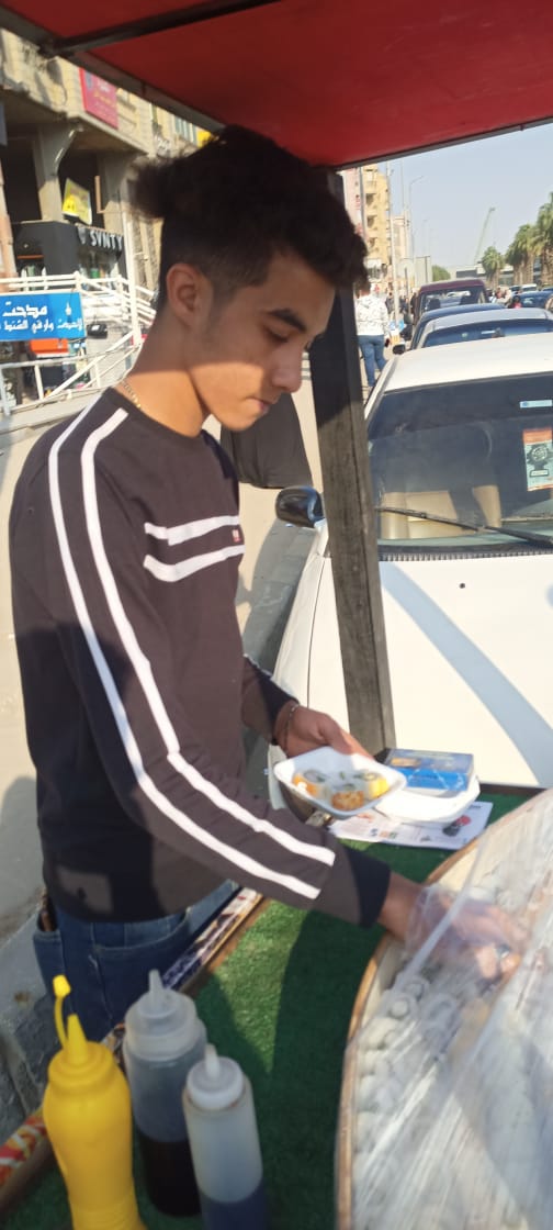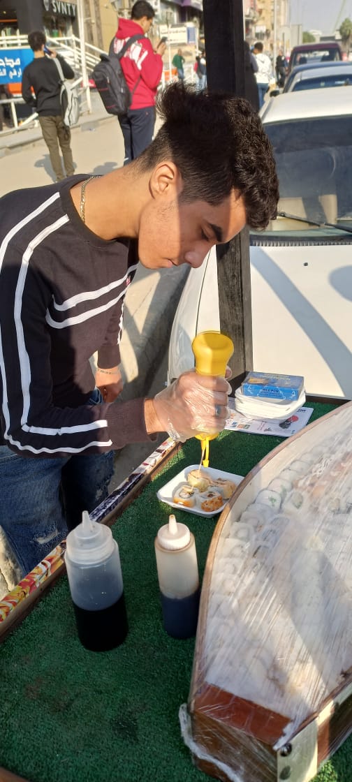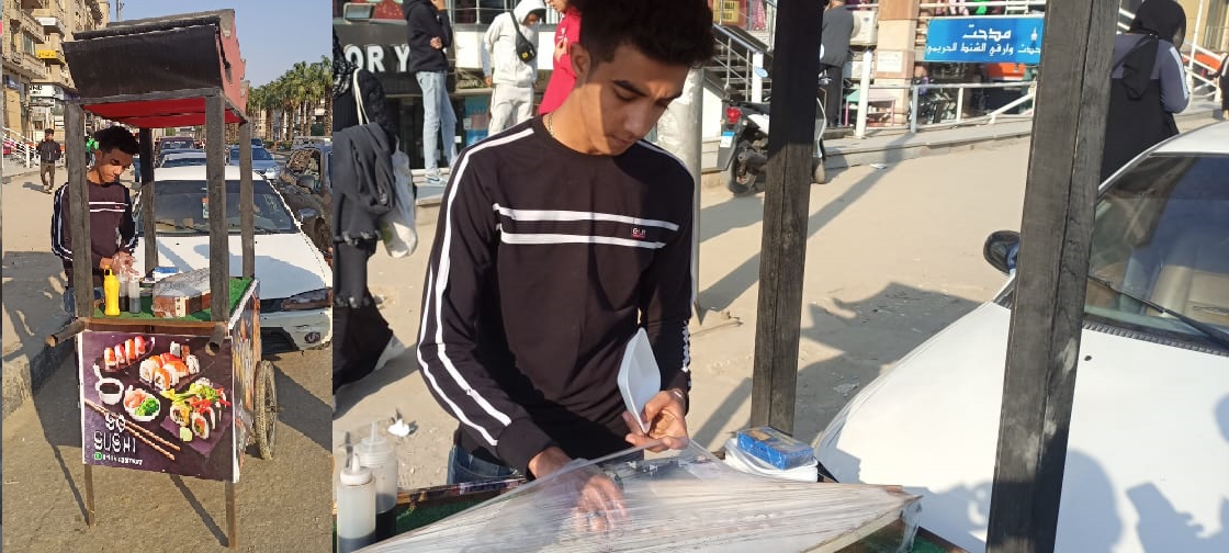 في منطقة الهرم، وقف على أحد النواصى الشاب فهد وليد، الطالب الجامعى، يبيع السوشي على عربة طعام صغيرة خاصة .