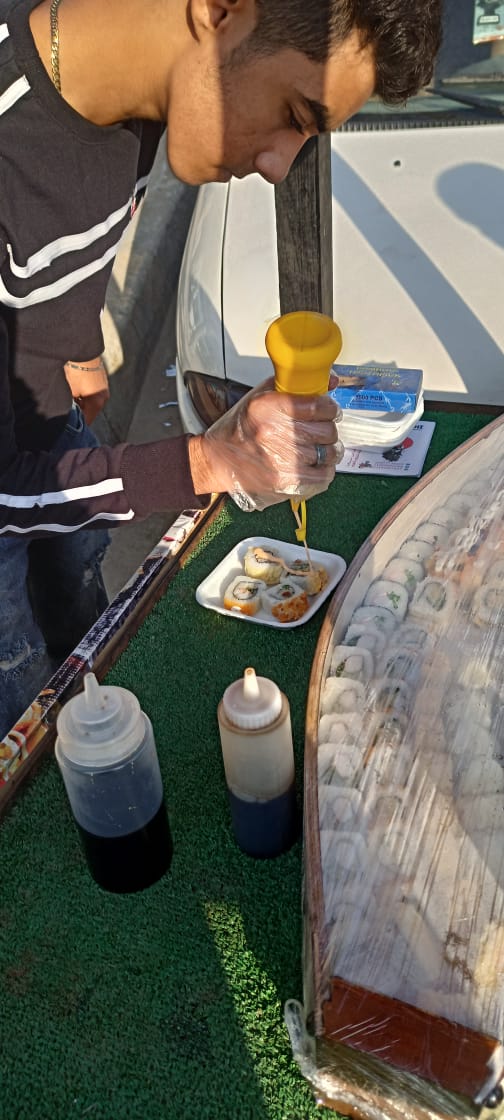قال بائع السوشى الشاب لـ “بيان” أن بضاعته من السوشي المطهو، يورده له شيف متخصص فى هذا النوع من الطعام، ويعمل فى مطعم كبير، ويقوم هذا الشيف، وهو فى ذات الوقت صاحب العربة التى يعمل عليها فهد بطهيه.