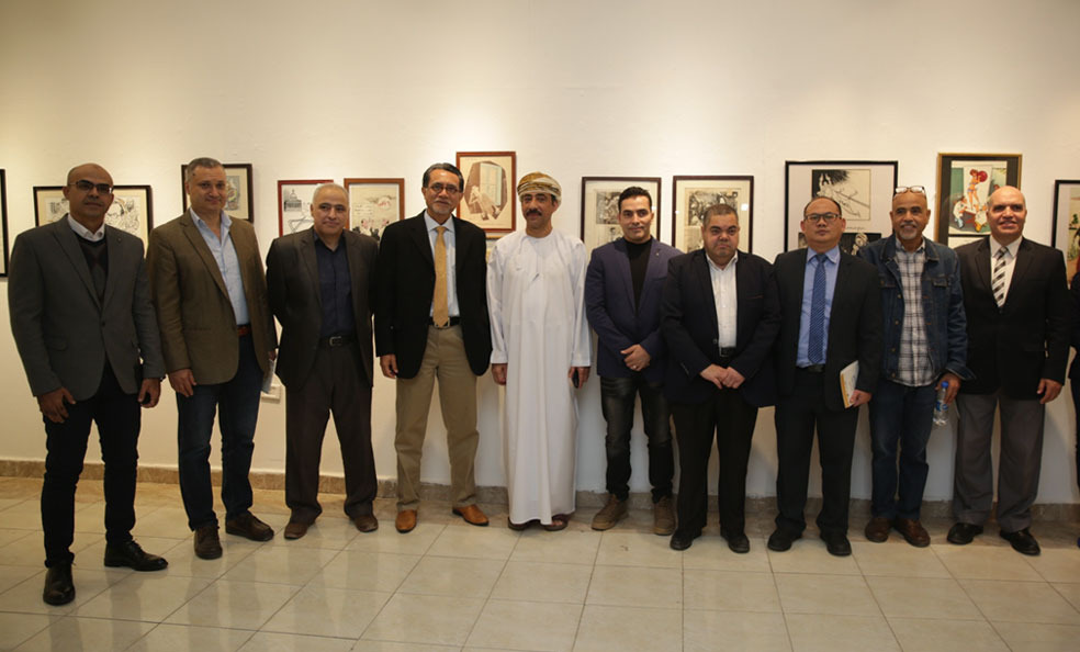 وحرص دكتور وليد قانوش، وسفير سلطنة عمان، وسفير أندونيسيا، والسادة الحضور أثناء تفقدهم للمعرض على زيارة القاعة التي تضم مجموعة من الأعمال الفنية والتي تتناول القضية الفلسطينية والتضامن مع أهلنا في فلسطين، خاصة أن هذه النسخة من عيد الكاريكاتير تم إهدائها الي أشقائنا في غزة الصابرين والصامدين الذين يقهرون بصمودهم وصبرهم وتضحياتهم وشهدائهم وحشية المحتل.