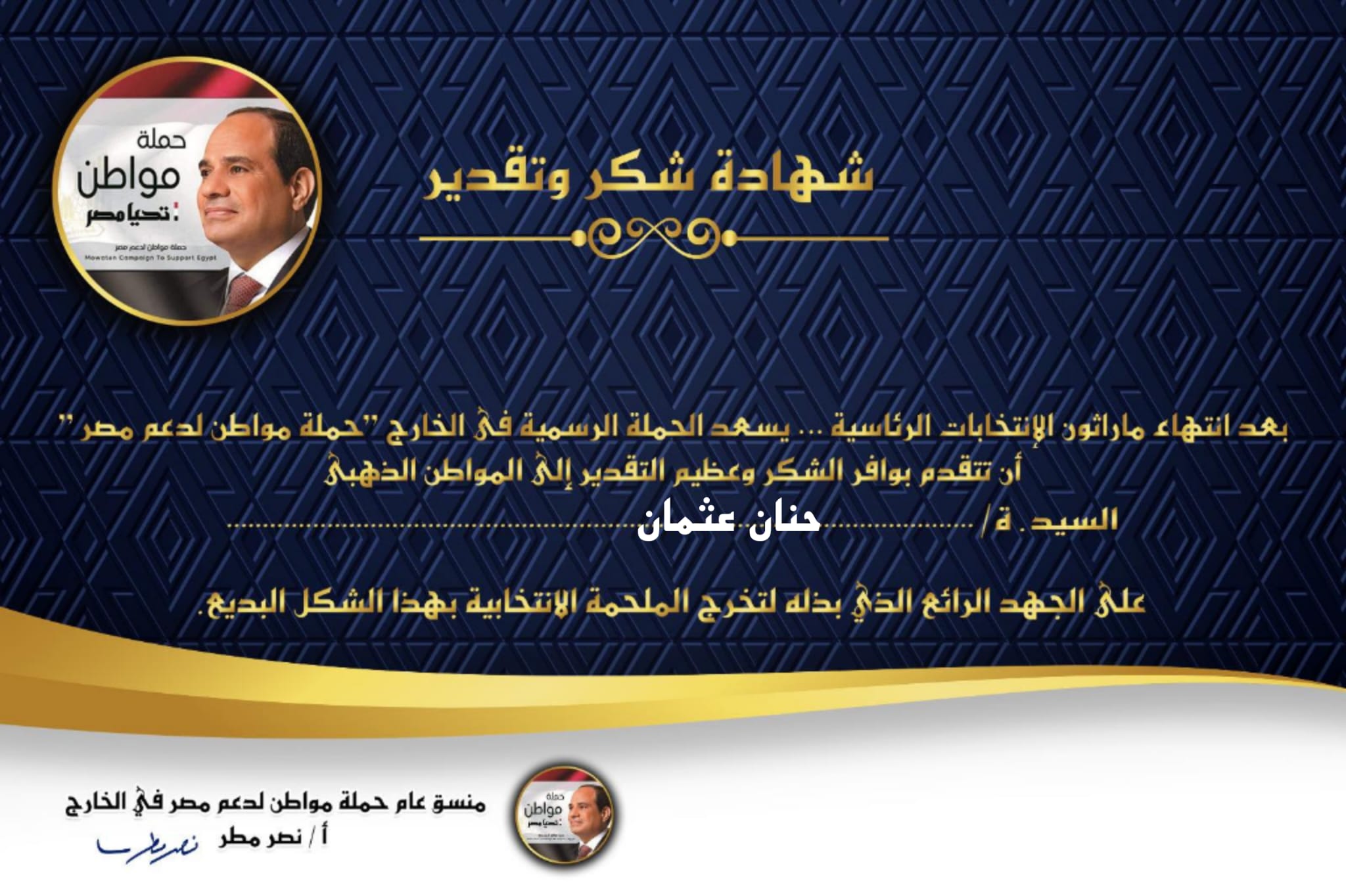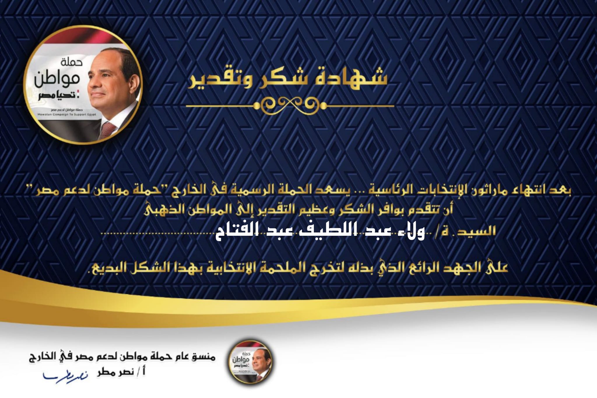 الحملة الرسمية للمرشح الرئاسى عبد الفتاح السيسي تكّرم مراسل “بيان” وأعضاء الحملة على جهودهم