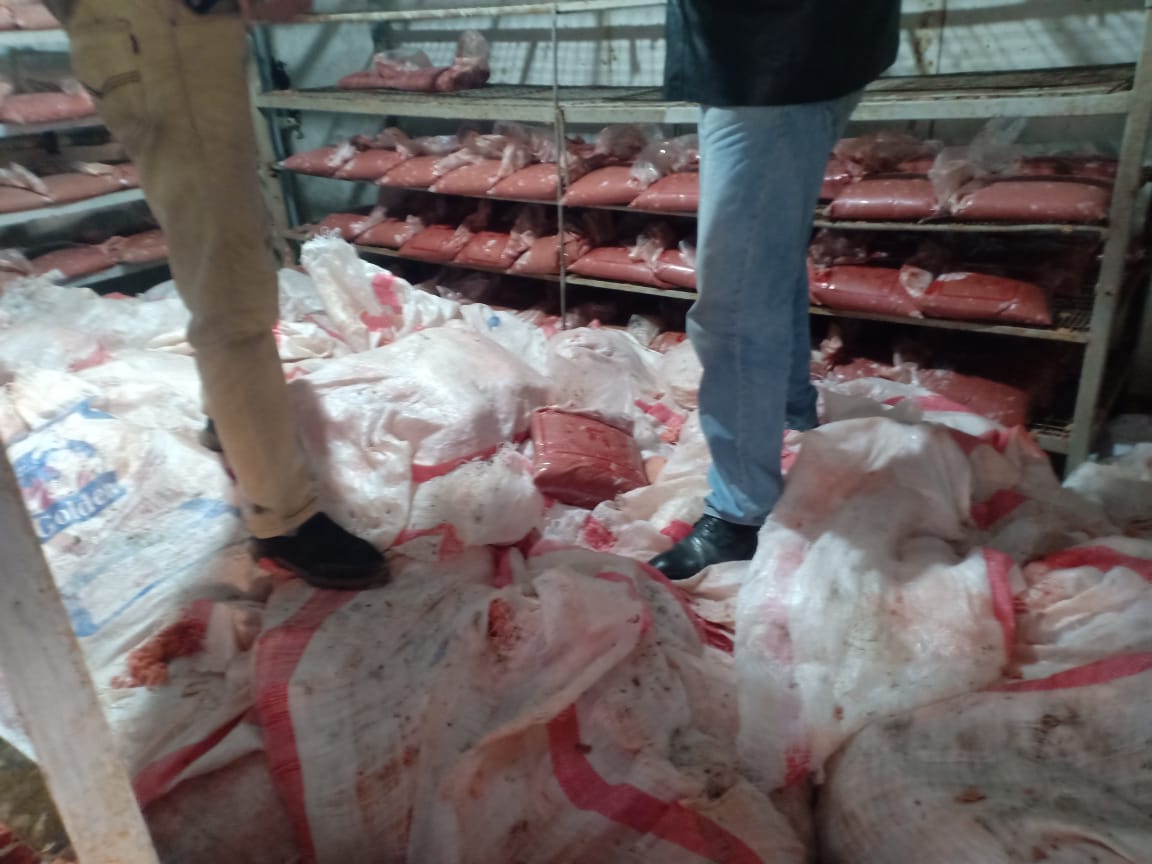 وبناء عليه تم ضبط 3 طن دواجن ولحوم مفرومة غير صالحة للاستهلاك الآدمي بمنطقة العكرشة بالخانكة وقد وأسفرت الحملة عن ضبط مكان بمنطقة العكرشة بالخانكة، تم تجهيزه لفرم الدواجن الكاملة وهياكل الدواجن مع إضافة مادة ملونة ضارة بالصحة العامة الى المفروم غير صالحة للآستهلاك الآدمى.