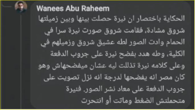 ولم تتحمل نيرة هذا الضغط، ولم تتمكن طالبة جامعة العريش نيرة من منع ذلك الابتزاز الذي أراد زملاءها ممارسته عليها، فما كان منها إلا أن، قدمت اعتذارا على “جروب الجامعة” وفى نفس الوقت اتخذت القرار بالتخلص من حياتها، بعد الضغط النفسي الشديد الذي تعرضت له.