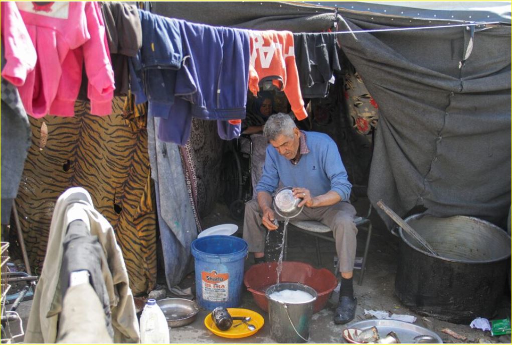 فايق الكفارنة كان يغسل الصحون أمام خيمته. وقال “قتلنا أفضل من هذه الحياة. نحن لا نعيش”. “نحن أحياء بسبب أن الموت لم يطولنا”