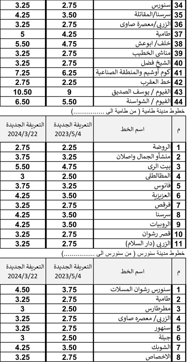 أعلن الدكتور أحمد الأنصاري محافظ الفيوم عن تعريفة الركوب الجديدة لخطوط سير السرفيس والتاكسي وسيارات الأجرة العاملة على الخطوط الداخلية والخارجية بين مراكز المحافظة، والمحافظات الأخرى، وذلك بعد إعلان لجنة التسعير التلقائي للمنتجات البترولية، تحريك أسعار البنزين والسولار، بدءاً من صباح اليوم الجمعة.