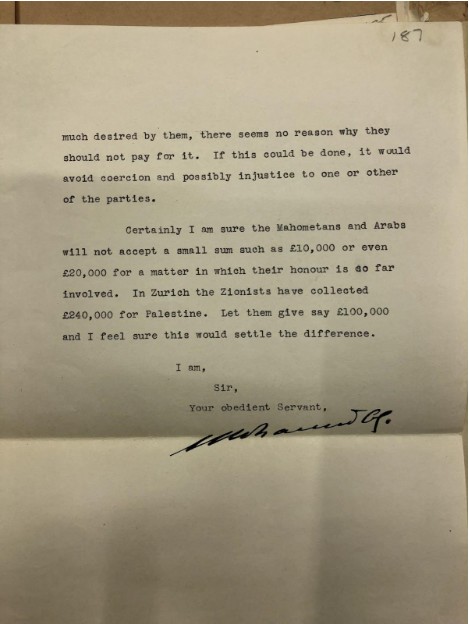 ولكن منذ اللحظة التي يبدو فيها أن يهوديًا من القدس قام بمحاولة (دون علم اللجنة الصهيونية بلا شك) لإجراء اتصال مالي مباشر مع المسلمين المعنيين، بدأ شيء يشبه الذعر، ومنذ ذلك اليوم ساءت الأمور. من سيئ إلى أسوأ فيما يتعلق بالآمال الصهيونية في هذا الصدد”.