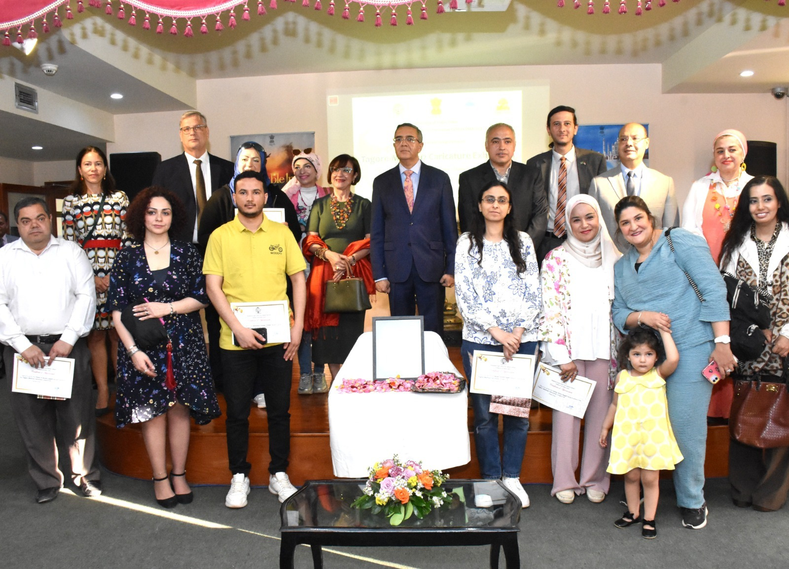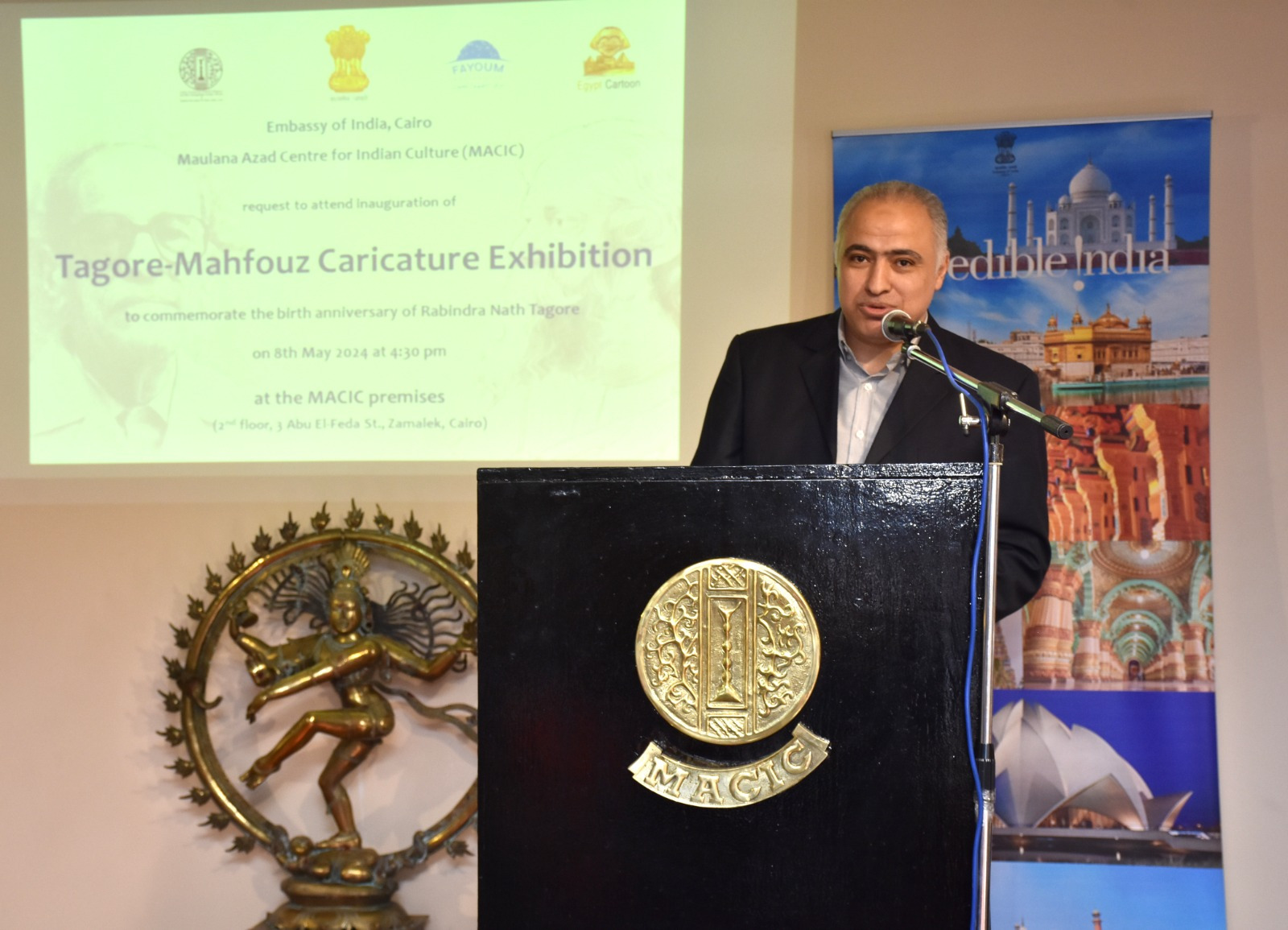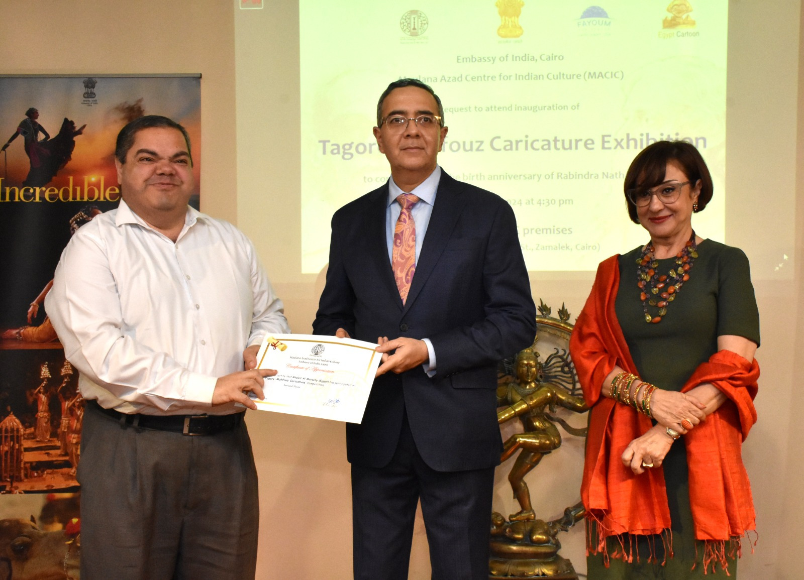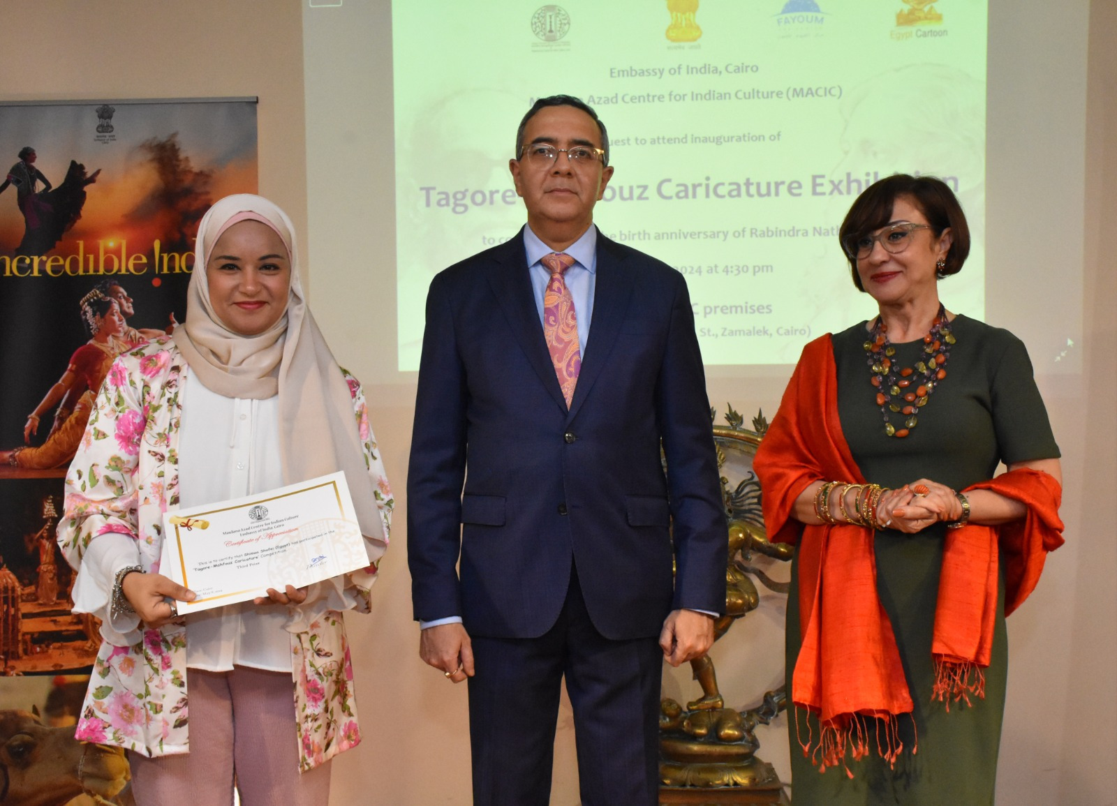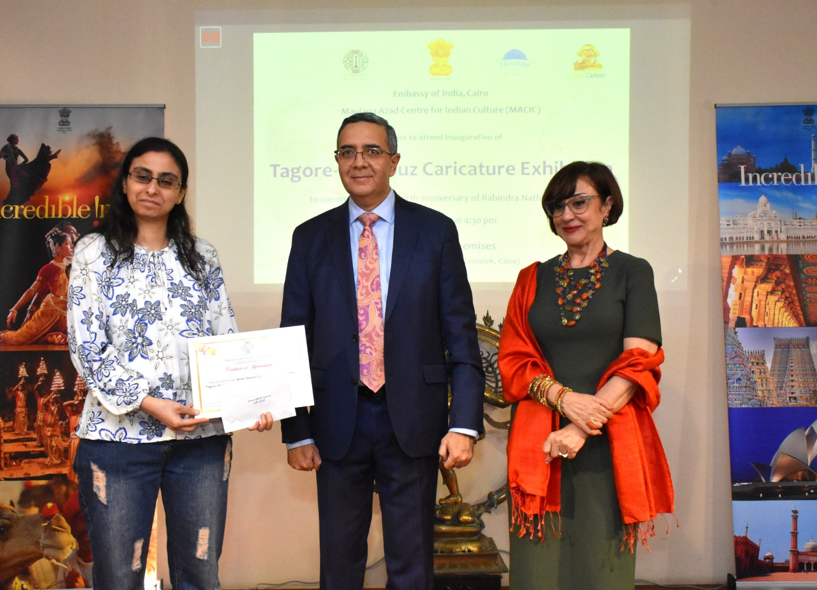 استضاف مركز مولانا آزاد الثقافي الهندي بالزمالك، معرضًا للبورتريه الكاريكاتيري تحت عنوان “طاغور ومحفوظ”، افتتح المعرض أجيت جوبتيه السفير الهندي بالقاهرة، والدكتورة كاميليا صبحي عضو مجلس الشيوخ، وفنان الكاريكاتير فوزي مرسي منسق المعرض، بحضور بيتر موليما سفير هولندا بالقاهرة، والدكتورة مجدلينا كروث المستشار الثقافي الإسباني بالقاهرة، ونخبة من فناني الكاريكاتير والفنانين التشكيليين وعدد من الصحفيين والإعلاميين والجمهور.