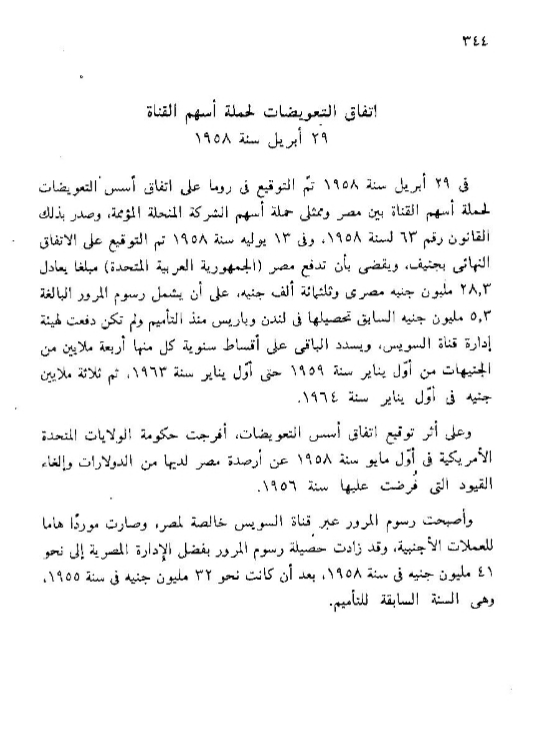 وفى ٢٩ أبريل ١٩٥٨ تم التوقيع فى روما على إتفاق أسس التعويضات لحملة أسهم قناة السويس.