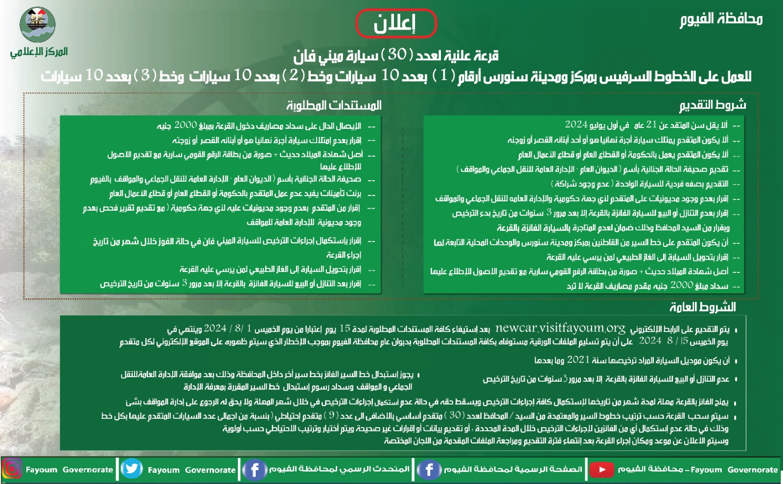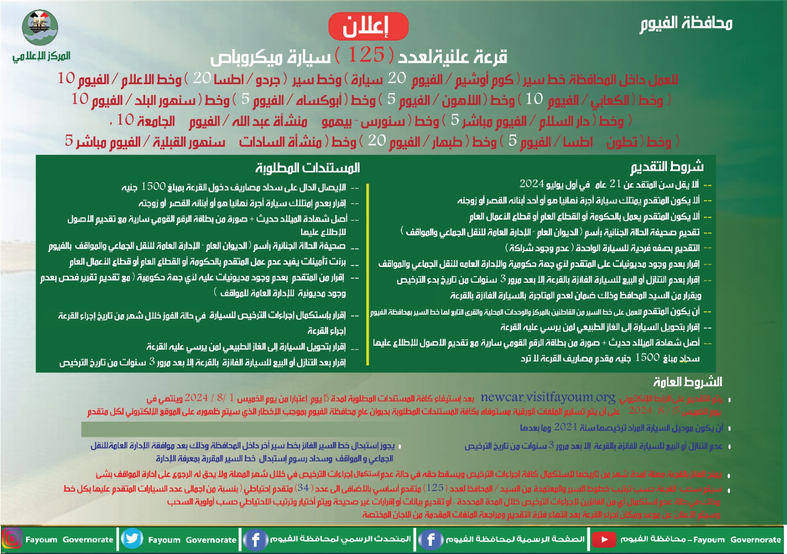 محافظة الفيوم تعلن عن إجراء قرعة علنية لتسيير ١٢٥ سيارة ميكروباص و ٣٠ سيارة ميني