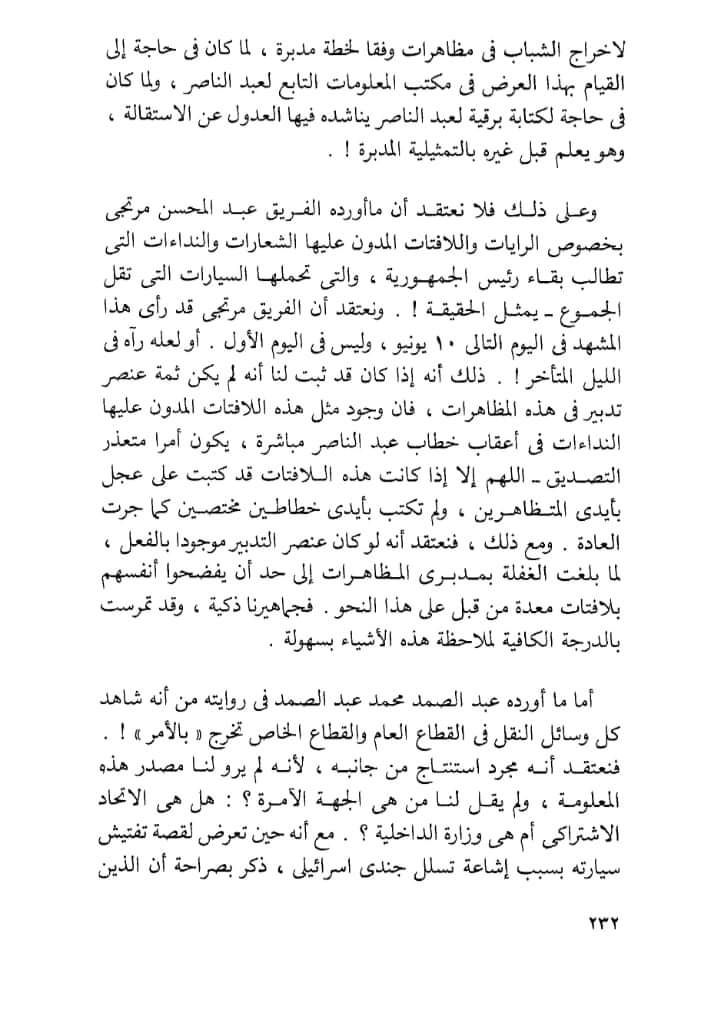 ((فى الواقع أن إتهام مظاهرات ٩يونيو ١٩٦٧ بأنها مظاهرات مدبرة هو إتهام مهين جدا للشعب المصري……