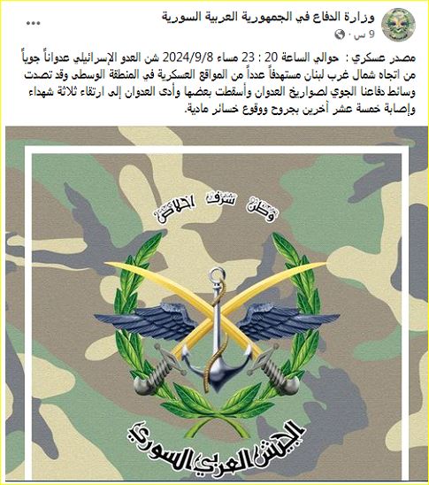 وقالت وزارة الدفاع في حكومة النظام السوري إن قصفًا إسرائيليًا استهدف مساء أمس، الأحد 8 من سبتمبر، من اتجاه شمال غرب لبنان مستهدفًا عددًا من المواقع العسكرية في المنطقة الوسطى، دون تحديد هذه المواقع بدقة.