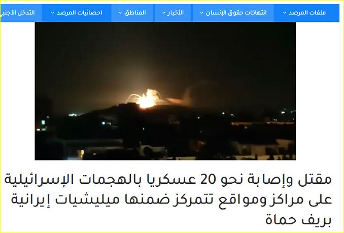 ودوى 13 انفجارًا عنيفًا في كل من منطقة البحوث العلمية بمصياف غربي حماة، كما سقط صاروخان إسرائيليان في موقعين بمنطقة الزاوي بريف مصياف، ما أسفر عن اشتعال النيران فيهما، واستهدفت الضربة أيضًا موقعًا على طريق مصياف- وادي العيون، وموقع آخر بمنطقة حير عباس.