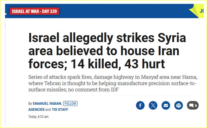 ووفق صحيفة “Times Of Israel“، يعتقد أن منطقة مصياف، غربي حماة، تُستخدم كقاعدة للقوات الإيرانية وقوات محور المقاومة الموالية لطهران، وسبق أن تعرضت لهجمات متكررة في السنوات الماضية نُسبت على نطاق واسع إلى إسرائيل.