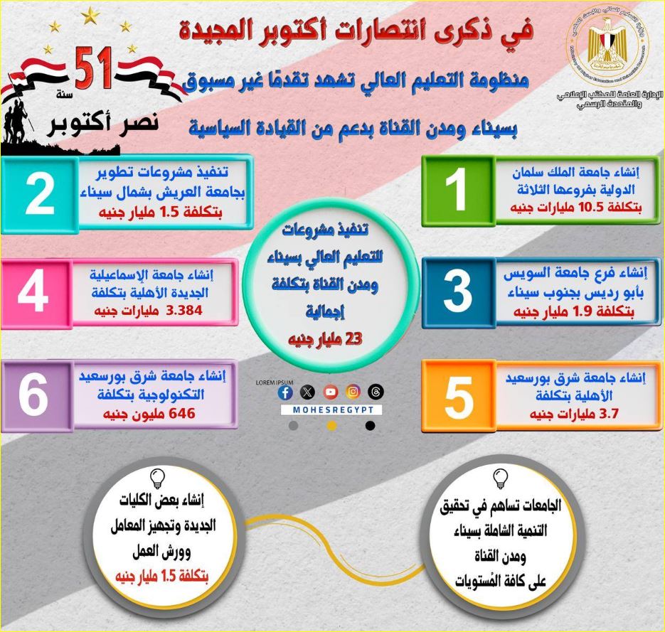 في إطار احتفالات جمهورية مصر العربية بحلول الذكرى الـ 51 لانتصارات أكتوبر المجيدة، وفي ضوء الاهتمام الكبير الذي توليه القيادة السياسية للمشروعات القومية الكبرى، وخاصة في شبه جزيرة سيناء ومدن القناة، فقد حظى قطاع التعليم العالي والبحث العلمي باهتمام كبير من جانب القيادة السياسية، وساهم ذلك في تحقيق التنمية في هذا الإقليم.