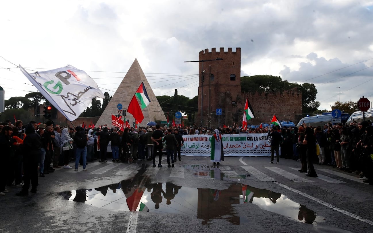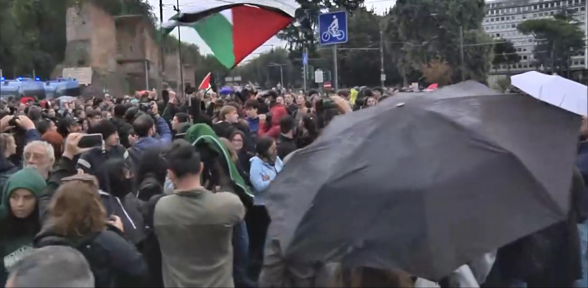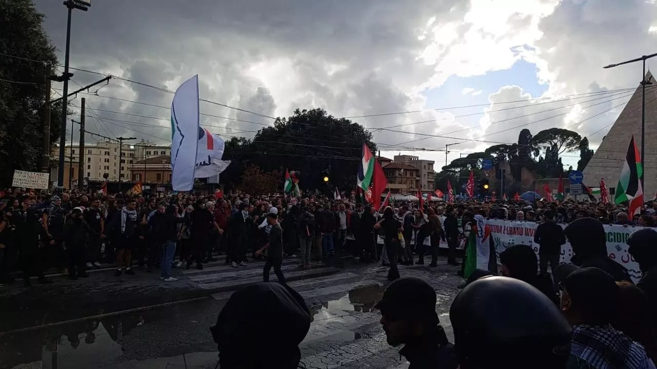 وبدت الأمور في بدايتها هادئة حيث تجمّع المتظاهرون رافعين لافتات مؤيدة لفلسطين وأخري تهاجم رئيسة الحكومة الحالية ” جورجيا ميلوني ” ولافتات تحمل رسما لوجهى رئيس وزراء إسرائيل ” نتانياهو ” وبايدن الرئيس الأمريكي، ووجهيهما ملطخان بالدماء.