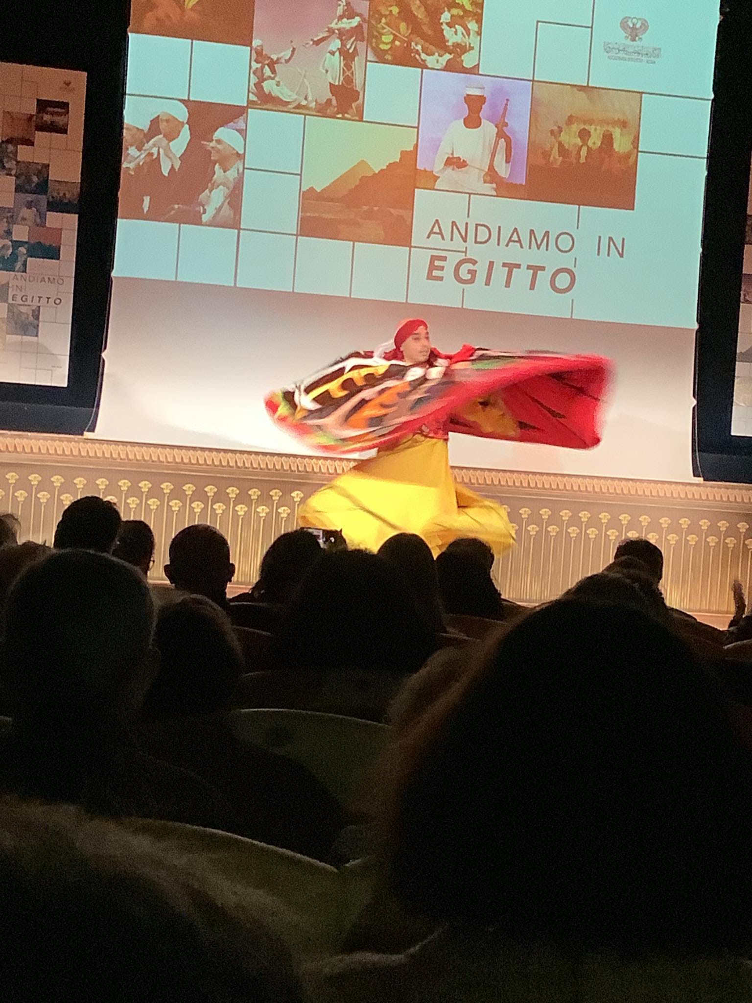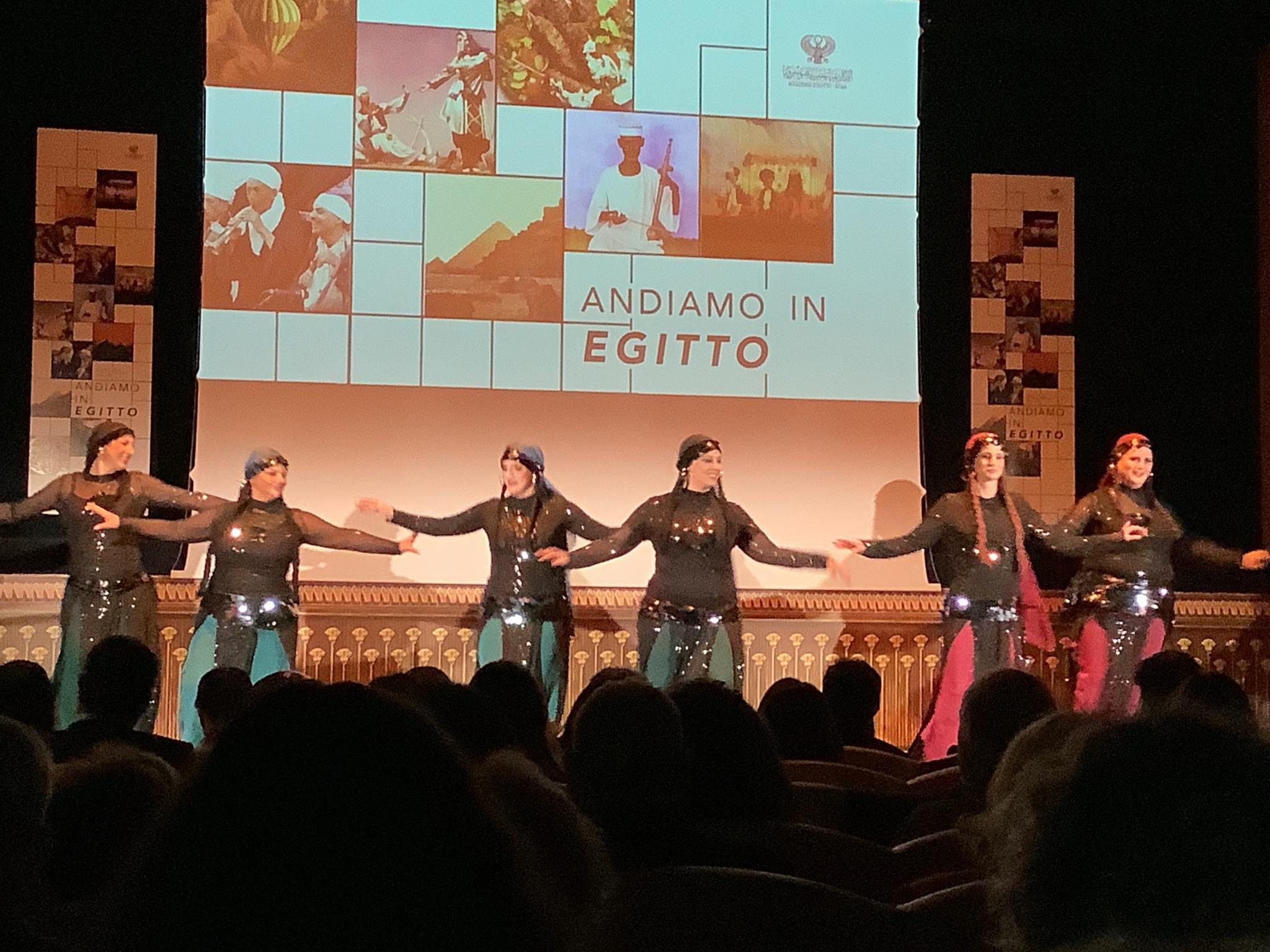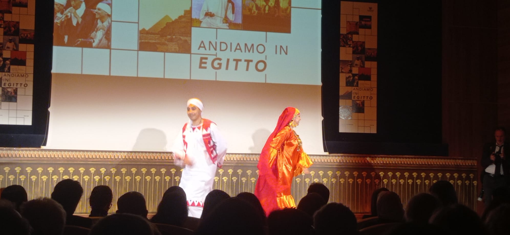 وبعدها قدم أحد فناني الفلكلور عرض التنورة ببراعة وأداء فني أبهر الحضور، تلاه عرض فلكلوري لبعض الرقصات المصرية الشهيرة قامت به إحدى الفرق الفلكلورية الإيطالية، والتي تنوعت ما بين الرقص الصعيدي والبدوي والشعبي، وسط تفاعل وإعجاب الحضور من الإيطاليين.