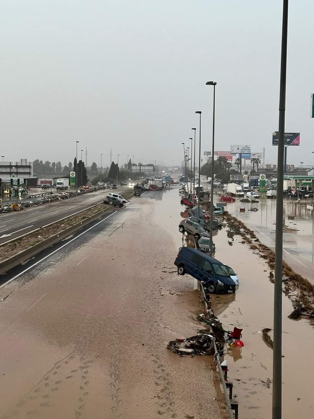 وأظهرت صور منتشرة على مواقع التواصل الاجتماعي سيارات مكدسة فوق بعضها البعض على الطرق، قرب مدينة فالنسيا الساحلية المطلة على البحر المتوسط، بفعل الفيضانات.