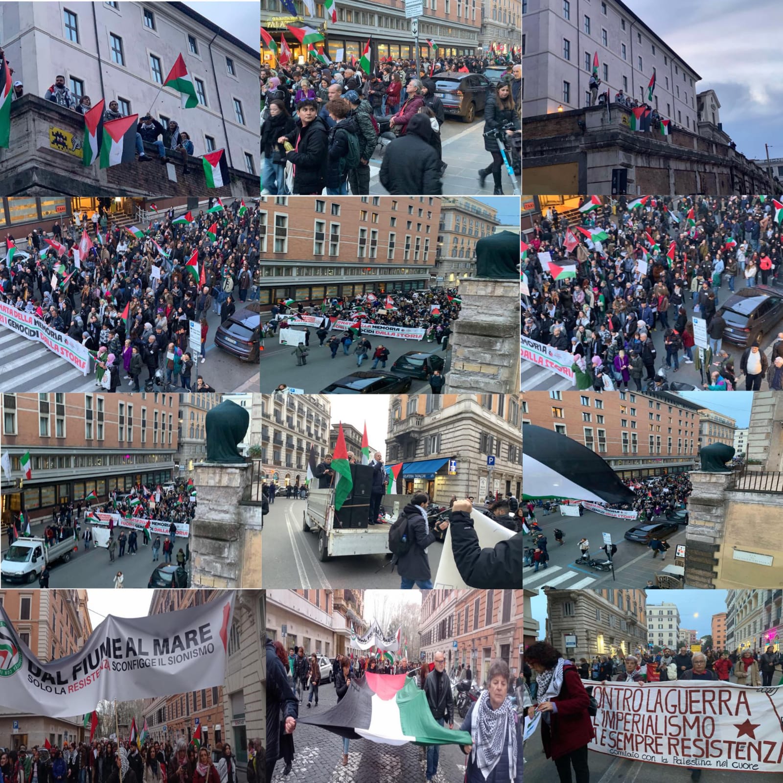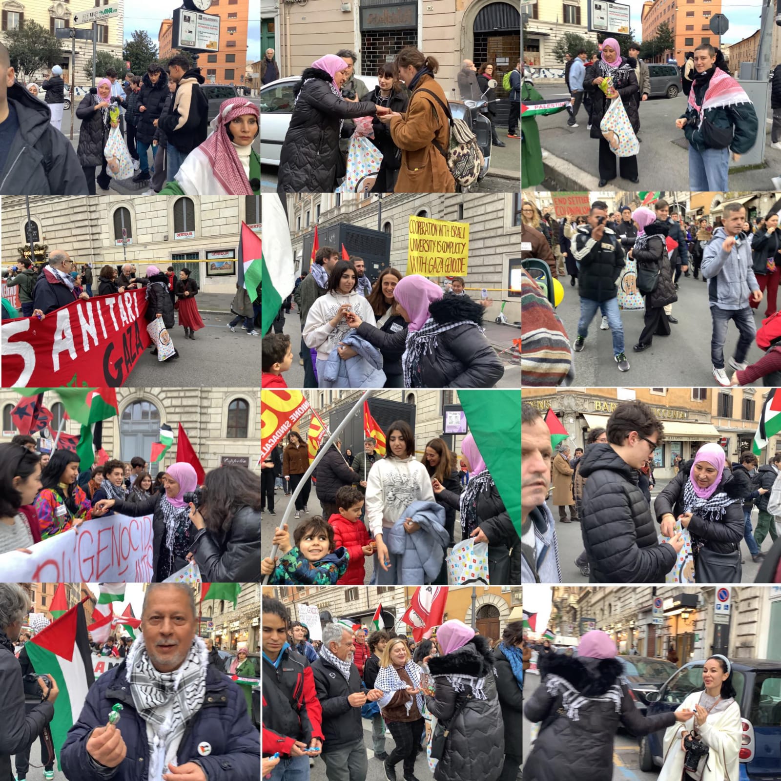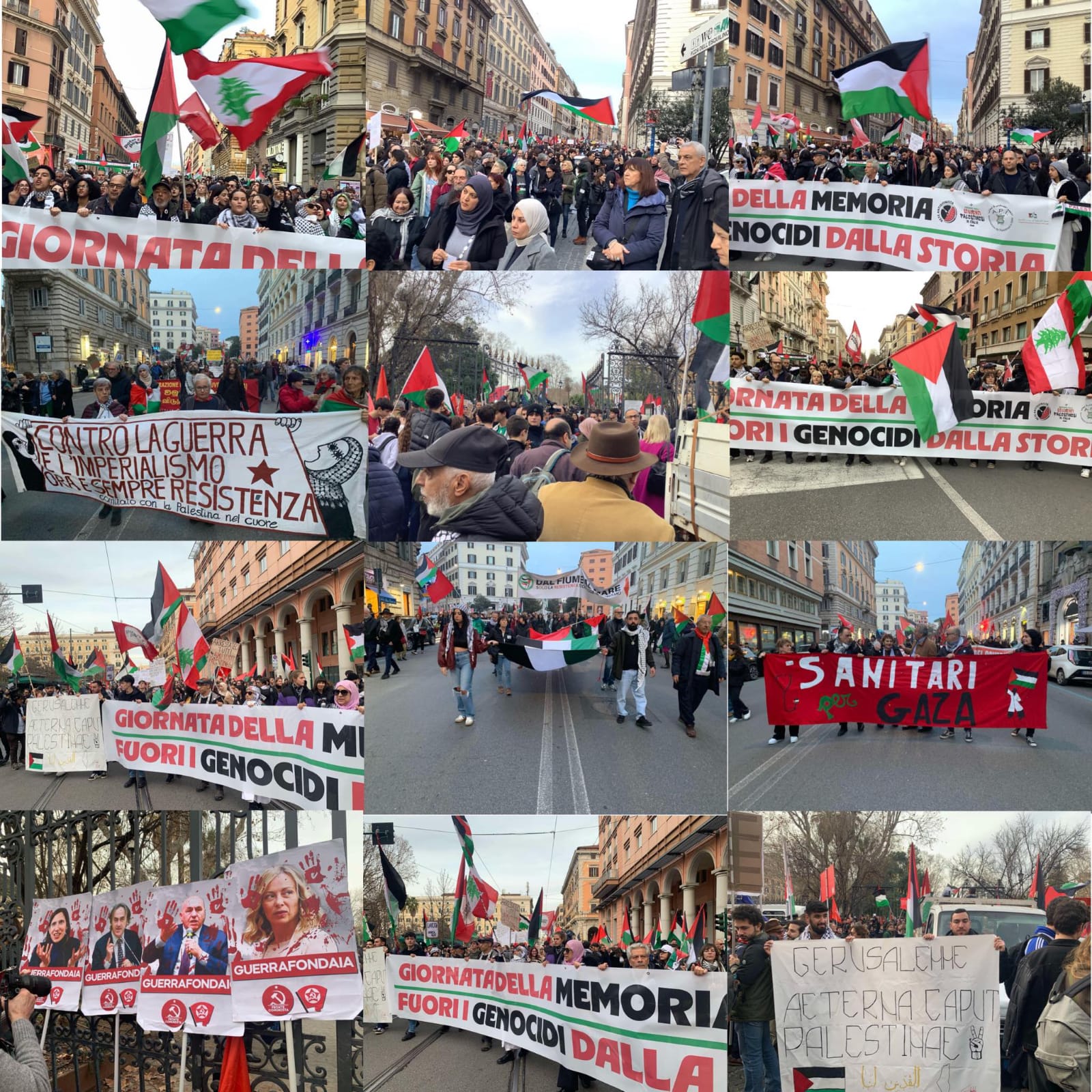 بدأت المظاهرة من ساحة فيتوري مانويلي وسط روما، بمشاركة واسعة شملت أبناء الجاليات العربية والأجنبية، إلى جانب الإيطاليين من مختلف الأعمار، وخاصة الشباب من طلبة المدارس والجامعات. وكالعادة، تصدرت النساء من الجاليات العربية المشهد، ورفع المتظاهرون لافتات تطالب باحترام الهدنة وتندد بالمجازر الإسرائيلية. كما حمل البعض صورًا لسياسيين إيطاليين بارزين، مثل رئيسة الوزراء جيورجيا ميلوني، مع وجوه ملوّثة بالدماء كإشارة رمزية لتواطئهم مع الاحتلال.