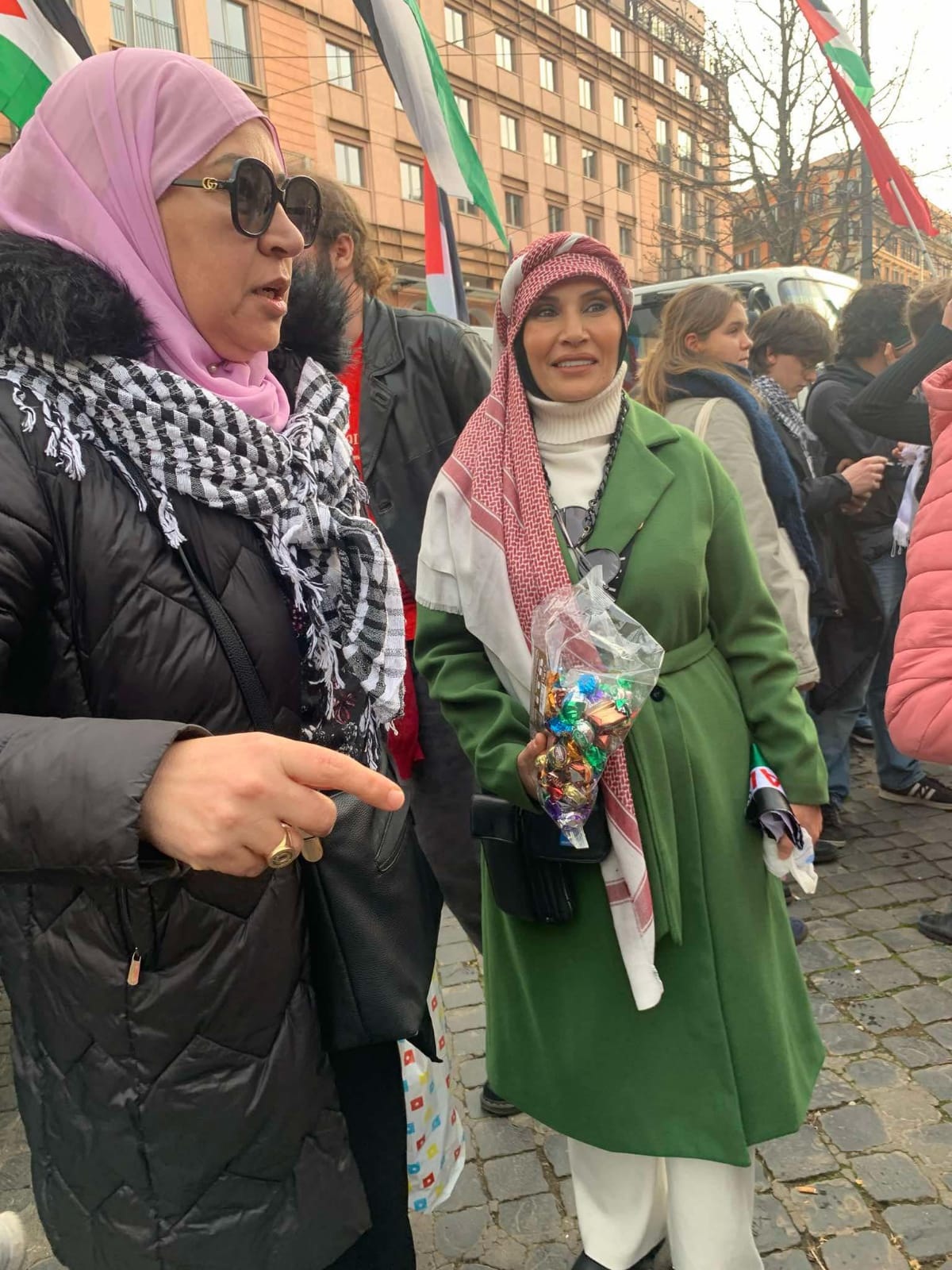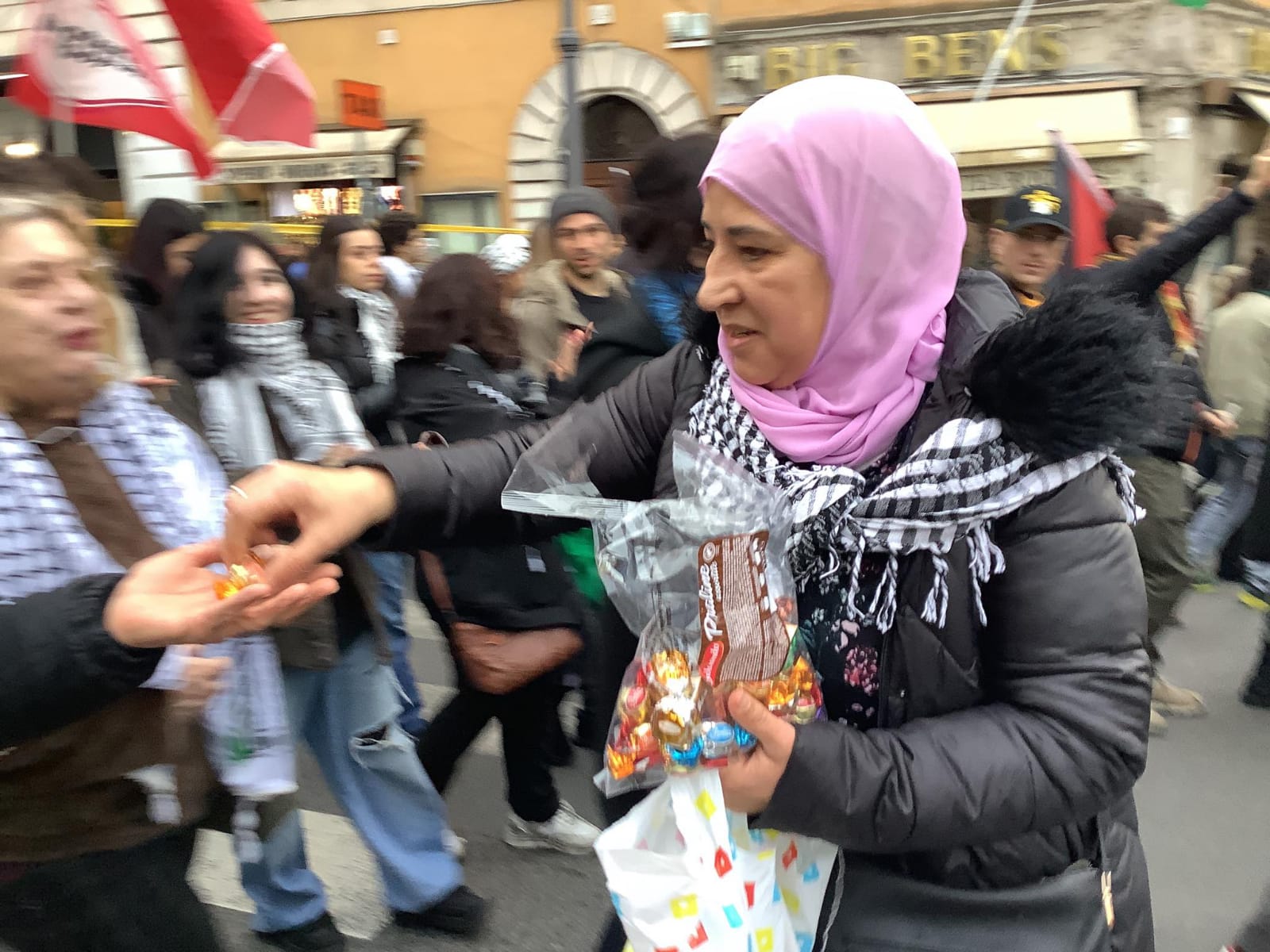 وسط أجواء التظاهر، قامت الناشطتان زينب محمد، رئيسة مسجد الهدى في روما، ورحاب عبد المنعم، بتوزيع الحلوى على المشاركين، بمن فيهم الصحفيون وأفراد الأمن. وصرحت زينب محمد بأن هذه المبادرة جاءت لنشر الفرحة والتأكيد على أن الشعوب العربية محبة للحياة والسلام، مشيرة إلى أن الحلوى تُعبر عن الاحتفال بالنصر، كما هي عادة المصريين في المناسبات السعيدة.