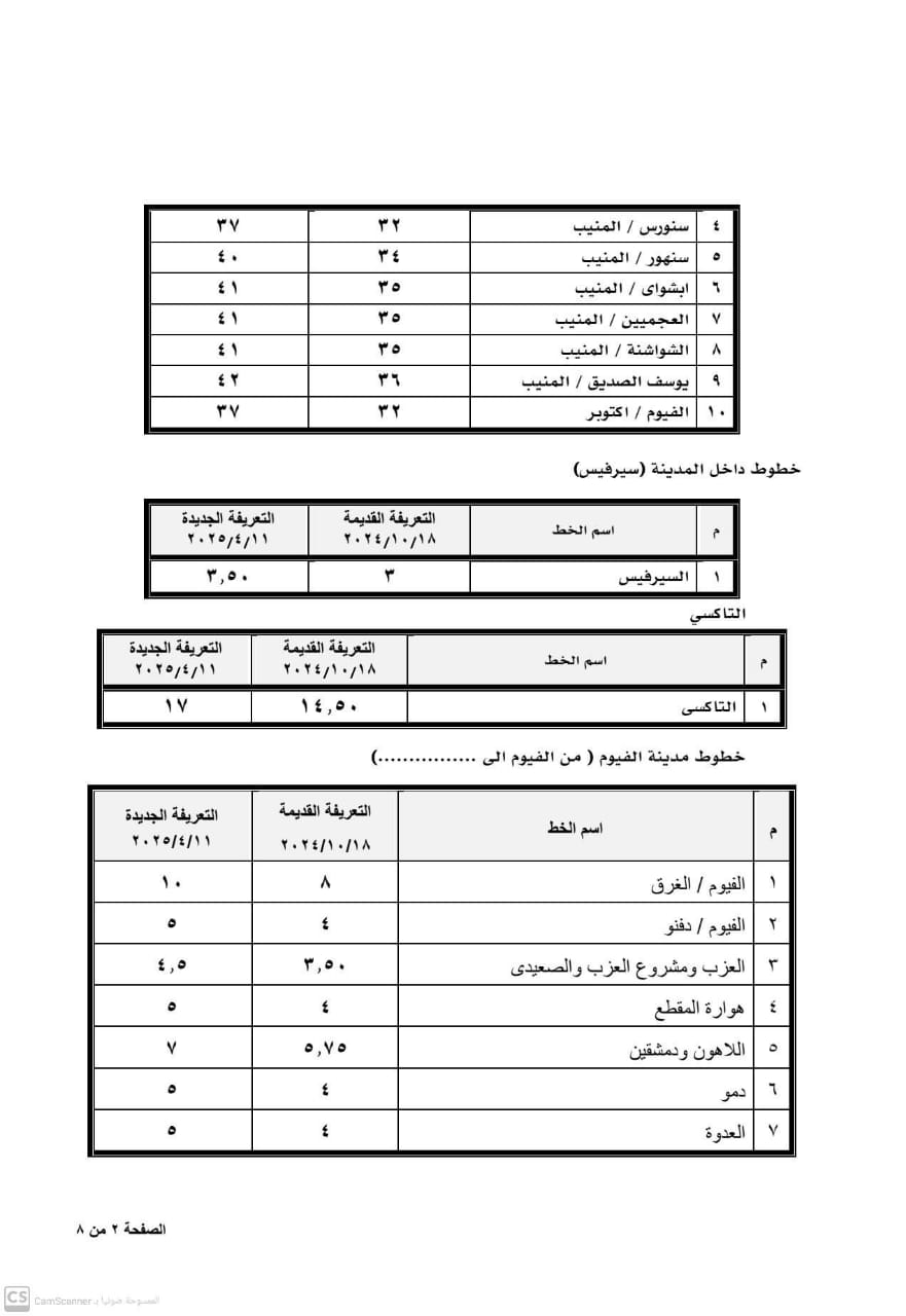 أعلنت محافظة الفيوم تعريفة الركوب الجديدة لخطوط سير السرفيس والتاكسي وسيارات الأجرة العاملة على الخطوط الداخلية والخارجية بين مراكز المحافظة، والمحافظات الأخرى، وذلك بعد إعلان لجنة التسعير التلقائي للمنتجات البترولية، تحريك أسعار البنزين والسولار، بدءاً من صباح اليوم الجمعة 11 ابريل 2025.