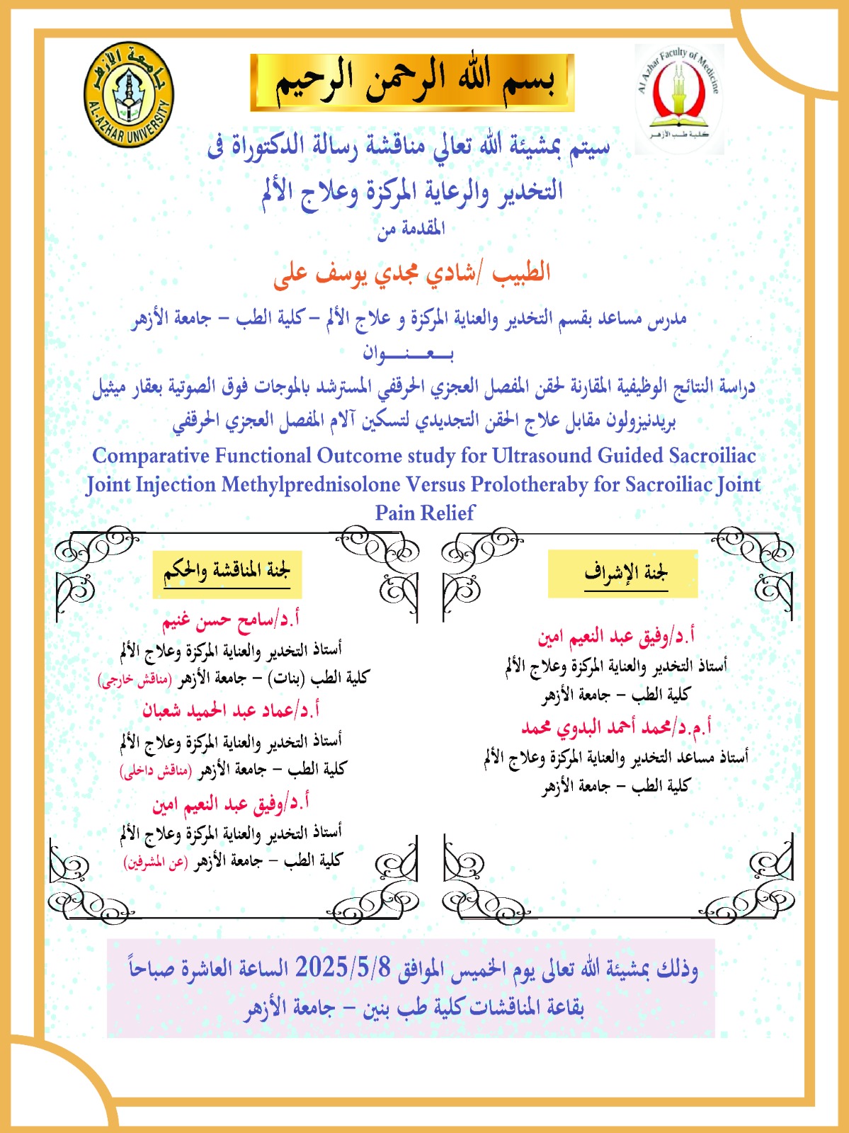 شهدت كلية الطب بجامعة الأزهر بالقاهرة مناقشة رسالة دكتوراه متميزة بقسم التخدير والرعاية المركزة وعلاج الألم، قدّمها الدكتور شادي مجدي يوسف، المدرس المساعد بالقسم، تناولت استخدام “الحقن المولّد” بمحلول الديكستروز عالي التركيز كوسيلة مبتكرة وآمنة لعلاج آلام المفصل العجزي الحرقفي، أحد الأسباب الشائعة والمزمنة لآلام أسفل الظهر.