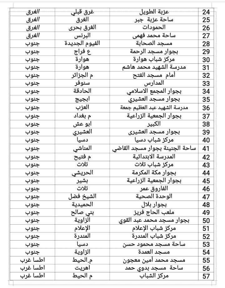 وأوضح المحافظ، أن الساحات الــ ١٩٥ التى تم تجهيزها لآداء صلاة عيد الأضحى المبارك بالفيوم، موزعة بواقع عدد ١١ ساحة ببندر الفيوم، وعدد ٤٤ ساحة بمركز الفيوم، وعدد ٤٨ ساحة بمركز ومدينة إطسا، وعدد ٢٩ ساحة بمركز ومدينة سنورس، وعدد ٣١ ساحة بمدينة ومركز طامية، وعدد ٢٠ ساحة بمركز ومدينة يوسف الصديق، وعدد ١٢ ساحة بمركز ومدينة أبشواى.