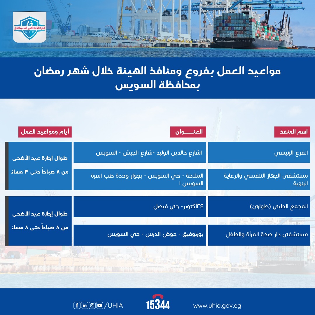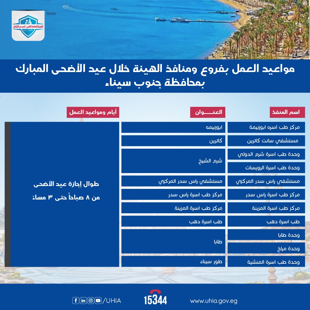 من جانبه، أكد مدير فرع التأمين الصحي الشامل ببورسعيد الدكتور محمد السباعي، أن المنافذ المفعّلة بالمحافظة خلال إجازة العيد تعمل من الثامنة صباحًا وحتى الثالثة عصرًا طوال أيام الإجازة، وتشمل كل من: (الفرع الرئيسي بحي الشرق، ووحدة المناخ 1، ووحدة مصطفى كامل بجوار مستشفى الأمراض النفسية، ووحدة عمر بن الخطاب، ووحدة شمال الحرية، ومركز تعاونيات الزهور، ووحدة بورفؤاد 2، ووحدة مناخ 2، ومركز مشالي بطريق التفريعة، ومركز عرب 1، ومركز الجوهرة بمساكن 5000).