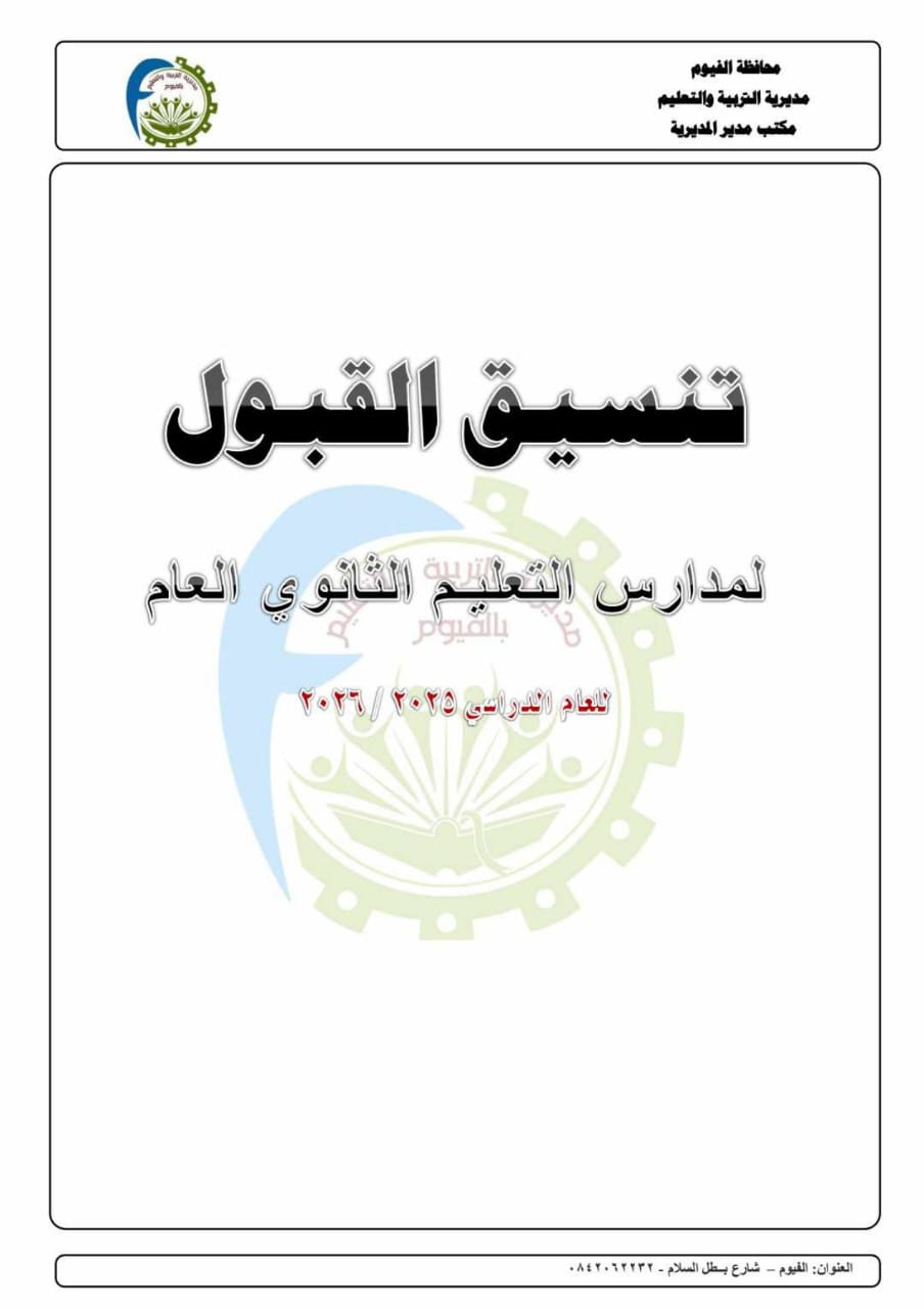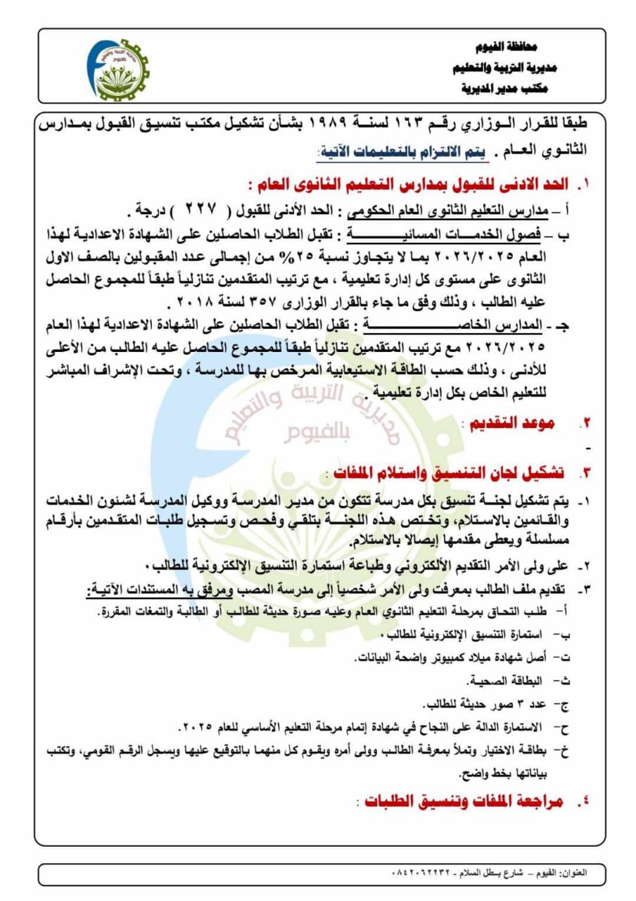 الفيوم: تنسيق القبول بالمدارس الثانوية العامة والدبلومات الفنية للعام الدراسي 2025/2026